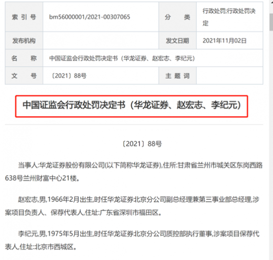 根据违法行为的事实、性质、情节与社会危害程度,中国证监会依据相关规定决定对华龙证券责令改正,给予警告,没收业务收入150万元,并处以300万元罚款。对时任华龙证券北京分公司副总经理兼第三事业部总经理赵宏志、时任华龙证券北京分公司质控部执行董事李纪元给予警告,并分别处以50万元罚款。