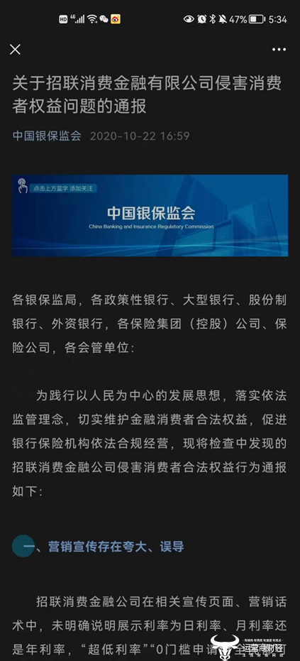 值得一提的是此次出现的一些问题在两年前就曾被点名过。2020年10月22日,中国银保监会在官网和官方微信公众号发布了《关于招联消费金融有限公司侵害消费者权益问题的通报》,通报显示,招联消费金融被指存在四大侵害消费者权益行为: