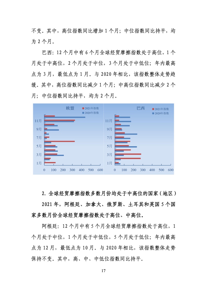 一是全球指数同比稳中有降,但较大经济体间经贸摩擦仍呈上升趋势。《报告》显示,全球经贸摩擦指数在2021年全年有6个月处于高位,同比减少3个月。从国家(地区)来看,2021年,印度、美国、阿根廷、欧盟、巴西和英国全球经贸摩擦指数的月均值处于高位。