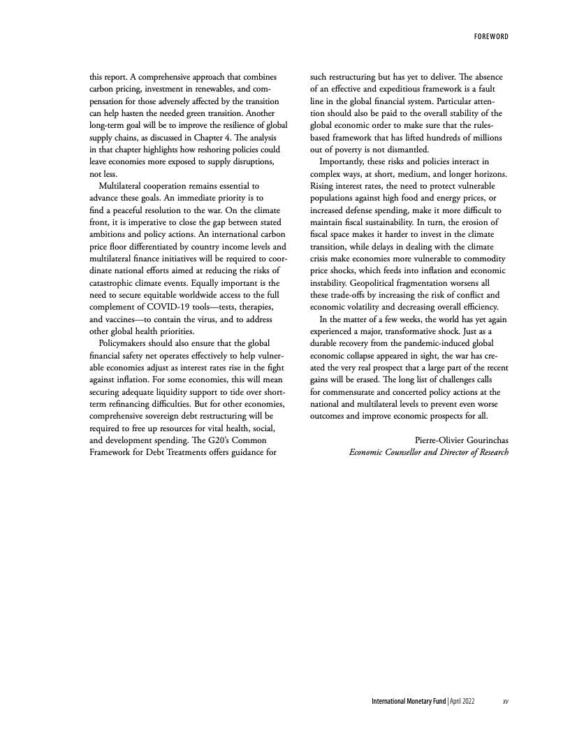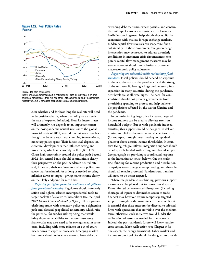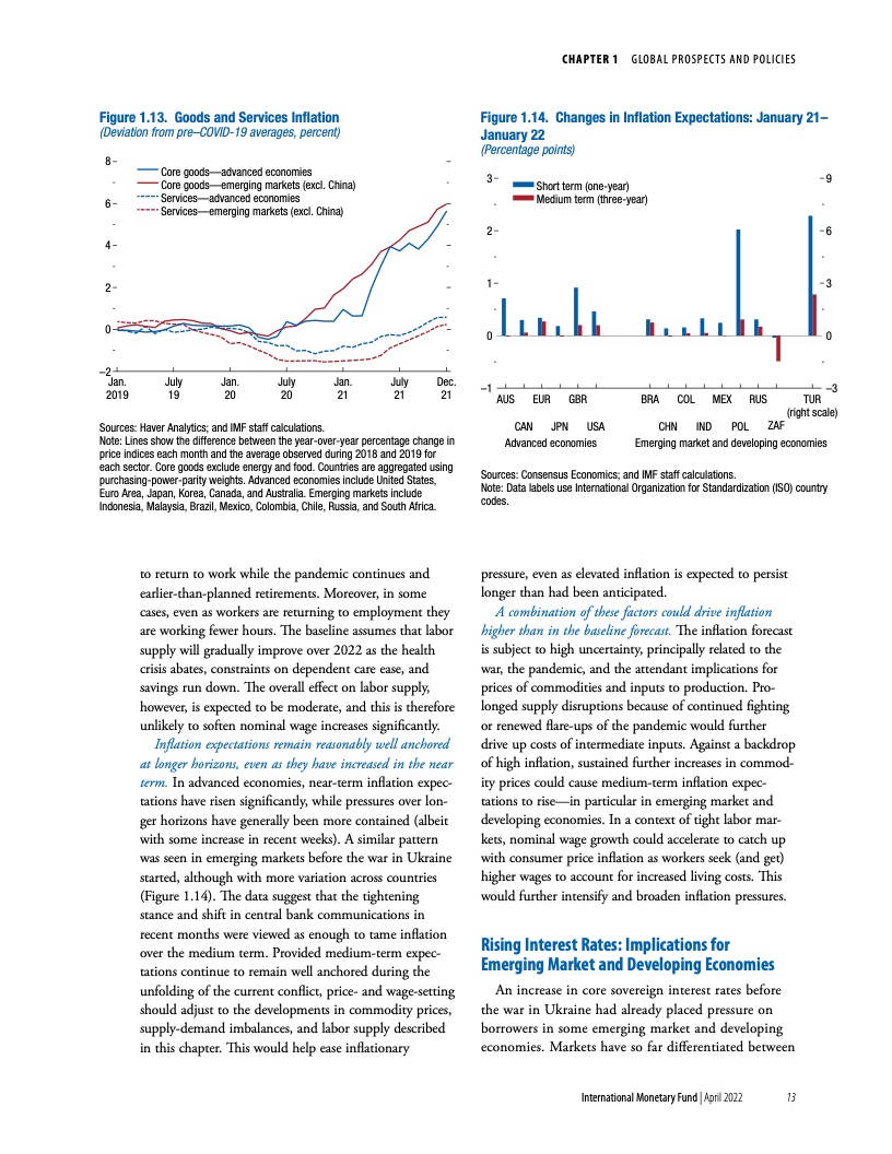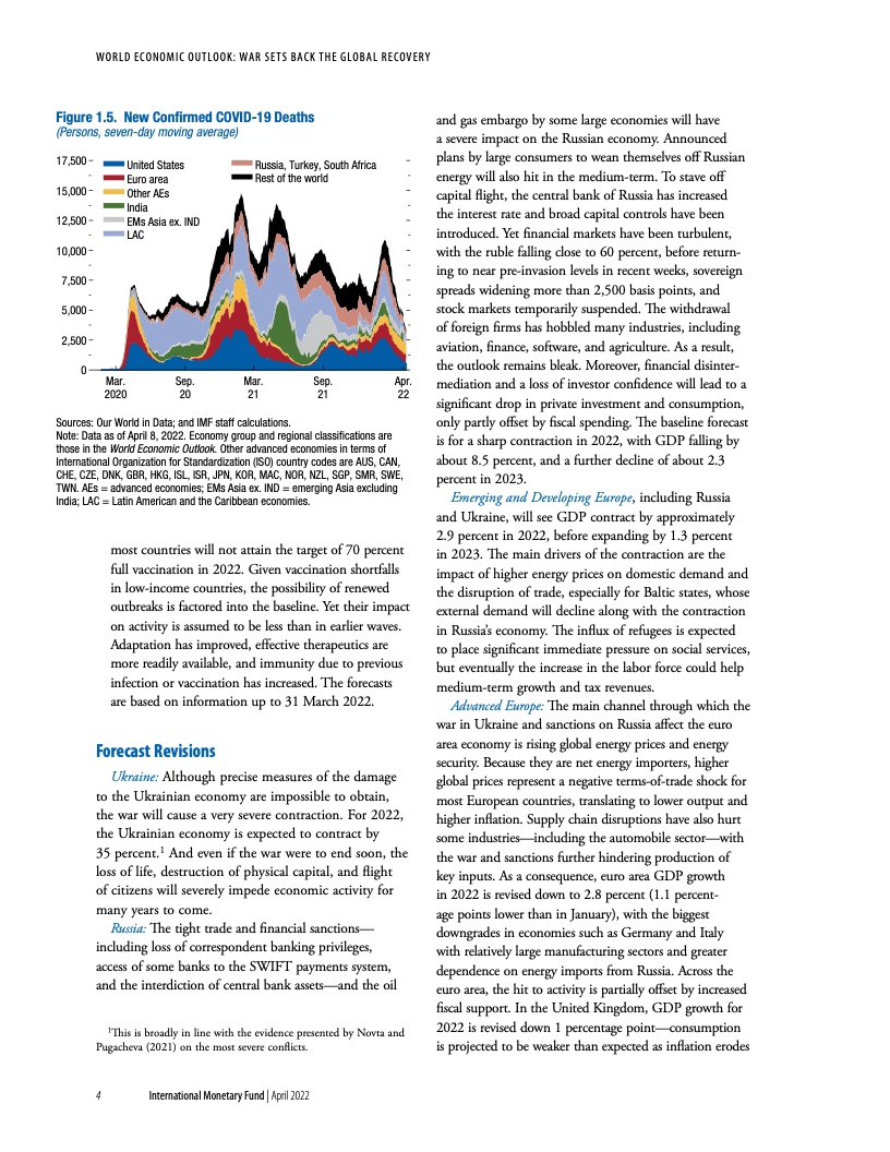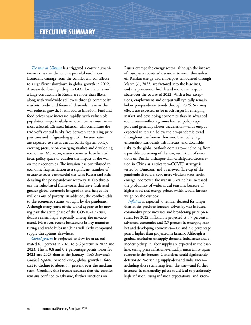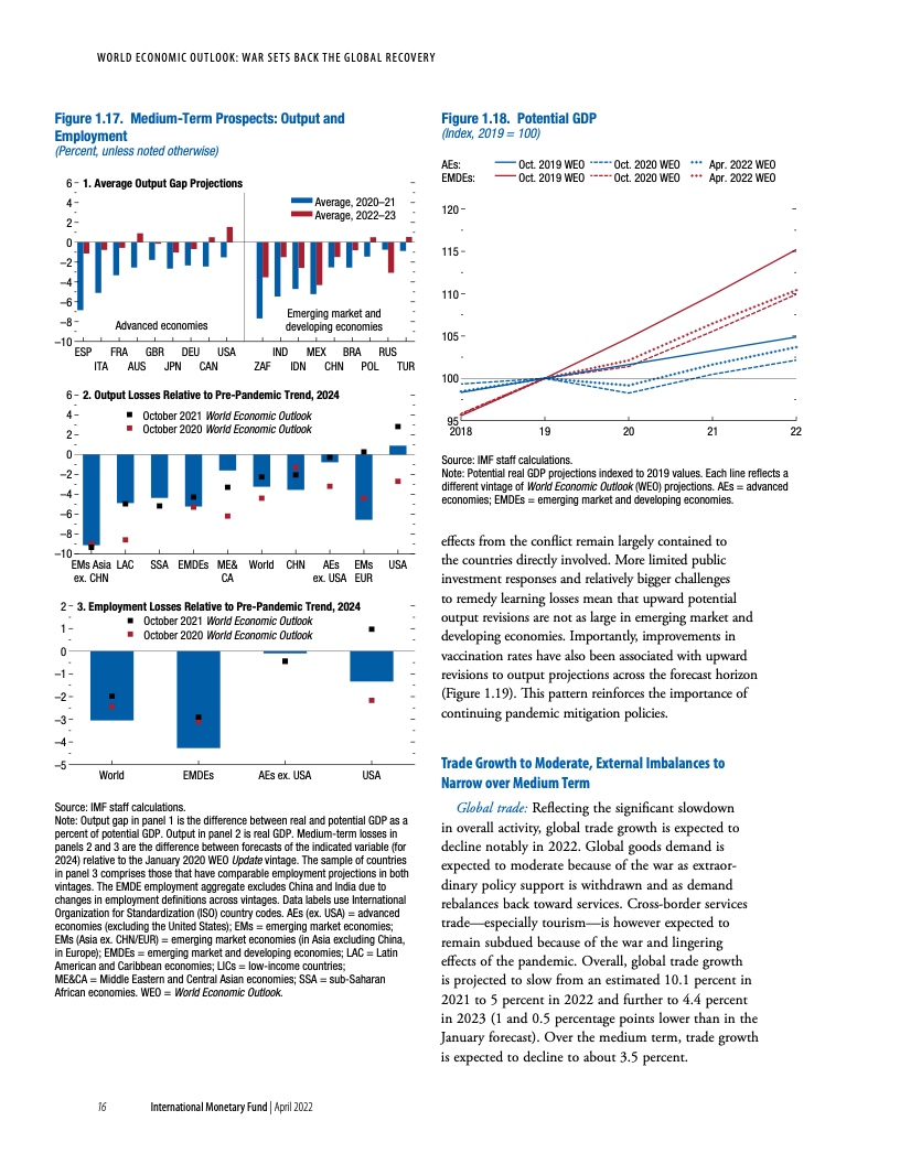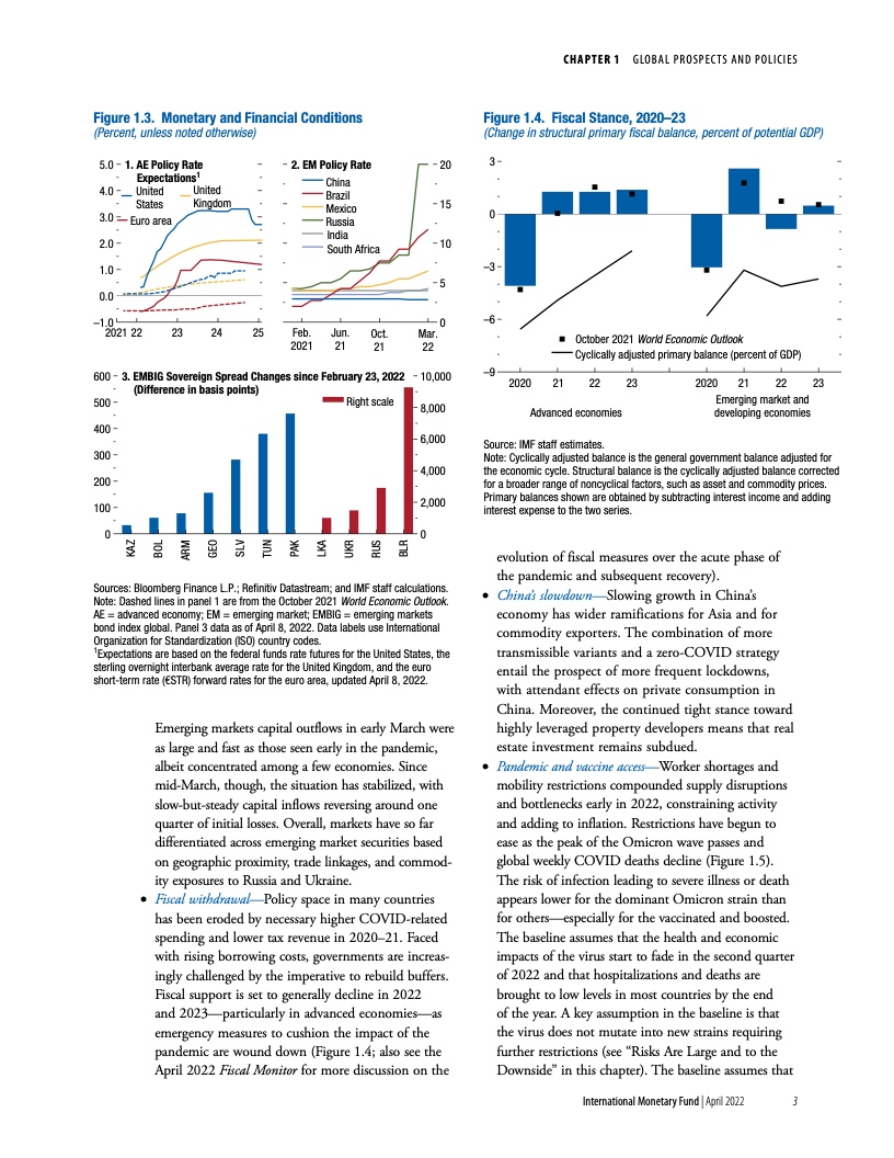 2023年之后,全球经济增速预计将放缓,并在中期回落至3.3%左右。2022年,发达经济体的通胀率预计为5.7%,新兴市场和发展中经济体的通胀率预计为8.7%,二者较1月的预测值分别高出1.8和2.8个百分点。各方应通过多边努力应对人道主义危机,防止经济进一步割裂,维持全球流动性,管理债务危机,应对气候变化,并结束新冠疫情——这些工作依然至关重要。