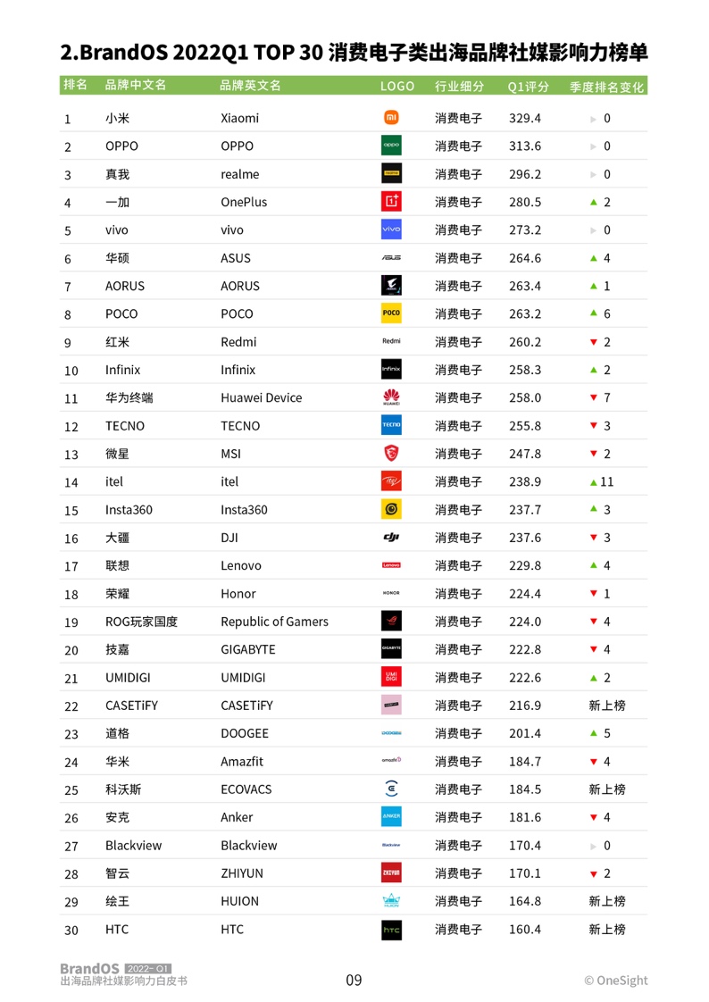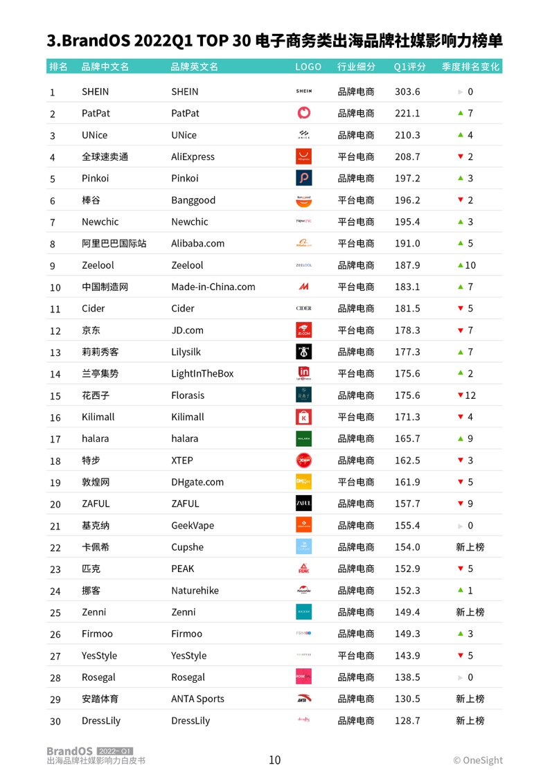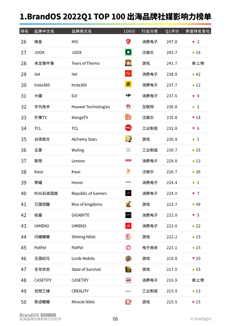 据海关总署最新数据,2022年第一季度,我国出口总值达到5.23万亿元,增长13.4%。从交易额上可以看出出海企业的持续增长态势。而将目光聚焦到海外社交媒体上同样,通过BrandOS出海品牌社媒影响力榜单,我们也看到了2022年第一季度中国出海品牌们在海外提升品牌力和建立影响力的持续增长。