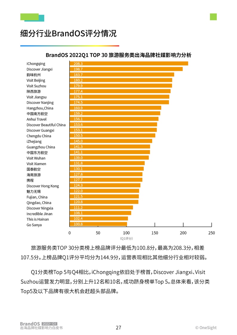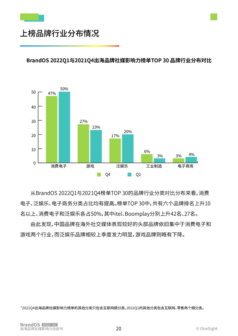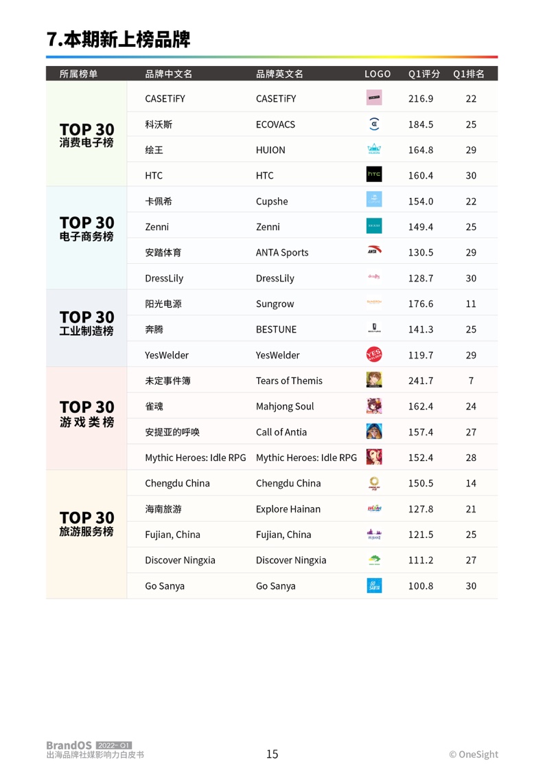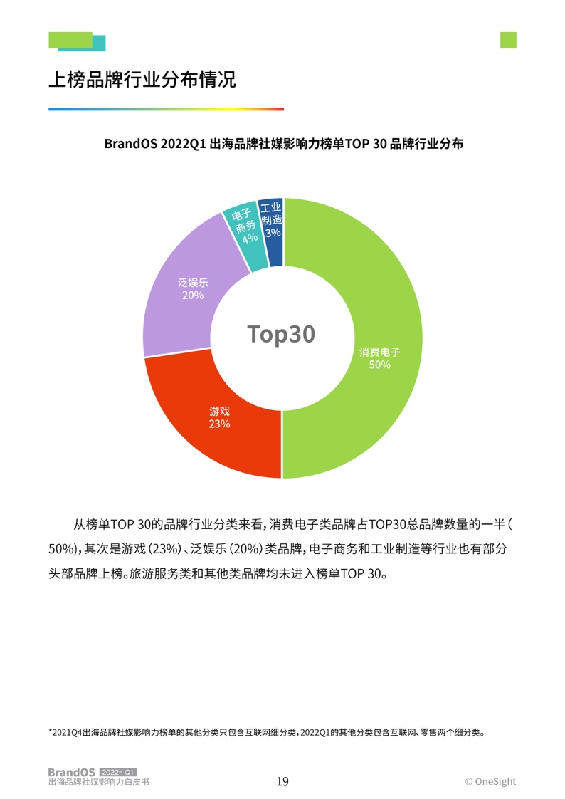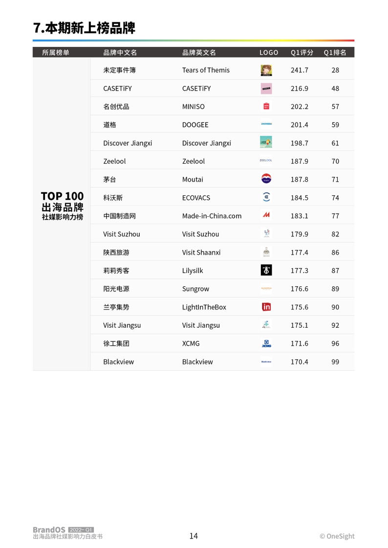 2022Q1《BrandOS TOP100出海品牌社媒影响力榜单》(以下简称“榜单”)显示,与上一季度相比,在不分行业的TOP100榜单中,第100名品牌的评分从上一季的168.2提升至本季度的170.1。虽然分值上涨并不多,但榜单上榜门槛已经实现了连续3个季度上涨。随着出海品牌对海外社交媒体的重视,我们相信这一趋势仍将长期存在。