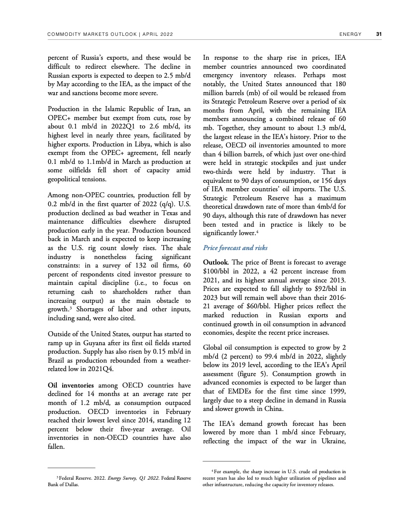 由于冲突导致贸易和生产中断,报告预计 2022 年布伦特原油平均价格为每桶 100 美元,是 2013 年以来的最高水平,比 2021 年提高 40% 以上。预计 2023 年将回落至 92 美元——仍远高于每桶 60 美元的五年平均水平。预计 2022 年(欧洲)天然气价格将是 2021 年的两倍,煤炭价格上涨 80%,均创历史新高。