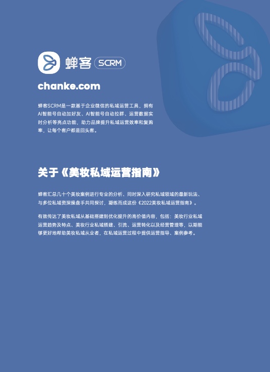 《2022美妆私域运营指南》内容包括:美妆行业私域运营趋势及特点、美妆行业私域搭建、引流、运营转化以及经营管理等。从引流到转化,私域玩法全面具体;从小众到大牌,案例拆解深入浅出;另外还有常见问题分析,教你避开运营大坑。