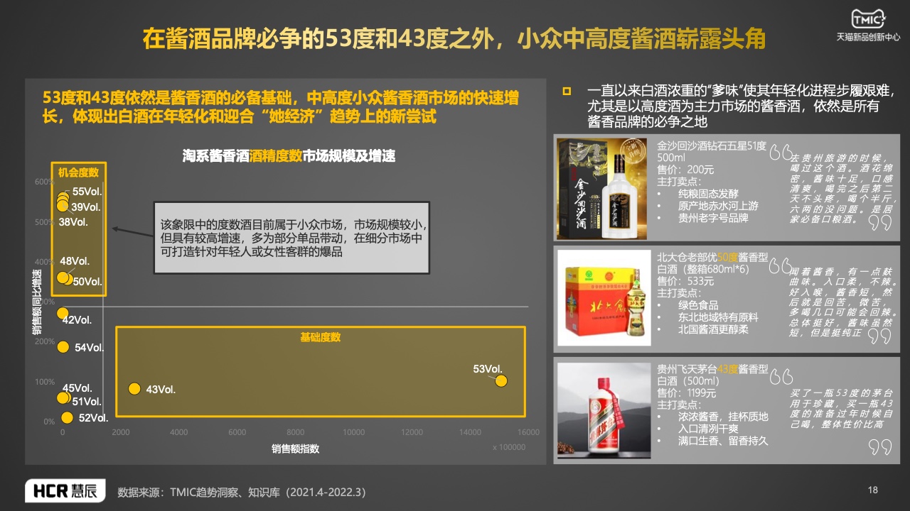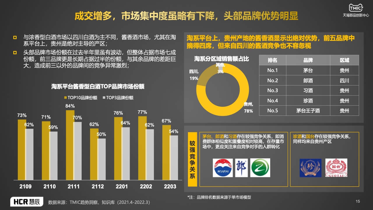 1.从市场分析:在整体白酒市场“去产能”的大背景下,酱香酒产能仍存在缺口,市场体量将进一步扩大。线上渠道方面,淘系平台酱酒市场高端领跑,有大促高端囤货和抢购两种快速销售方式引领抢购热潮;另有数据分析,茅台占酱香酒市场份额比例较大,但茅台的线上销售情况受配额影响,因此剔除茅台后的数据可以直观看到酱香酒在淘系平台表现。据2021年4月到2022年3月数据,淘系酱香白酒增速达76%。虽然先后经历了白酒新国标的实施以及疫情再次爆发,以致市场增速放缓,但每月仍能保持同比增长。在淘系平台上,贵州是酱香酒市场的绝对主导产区。