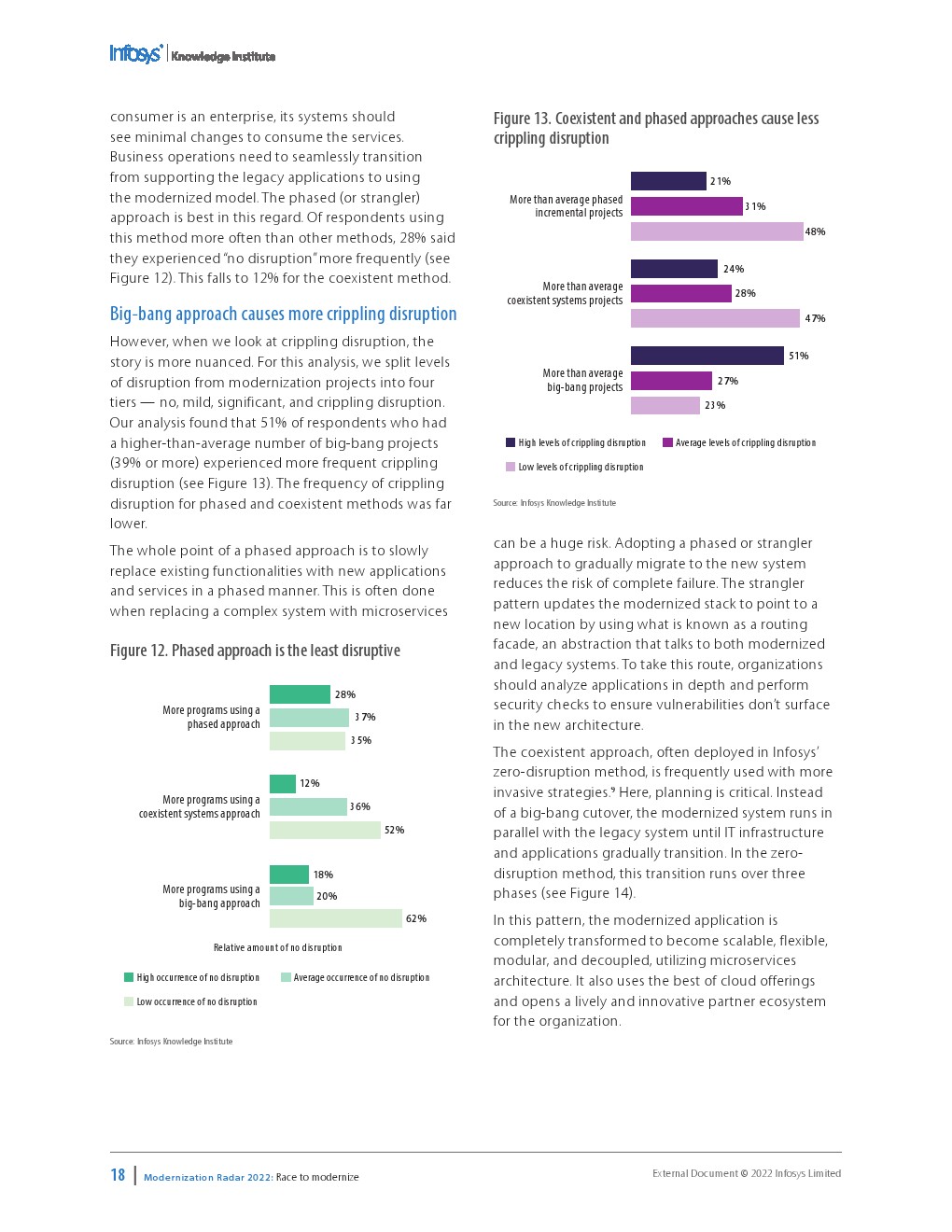分阶段的现代化比一次完成所有事情的风险要小。相同的分析适用于共存方法,其中现代化系统与正在转型的遗留应用程序并行运行。大爆炸方法更有可能导致严重破坏,超过一半的受访者(51%)使用这种方法比其他方法更频繁地经历更严重的破坏。