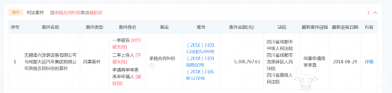 据企查查资料显示,无锡南兴涂装设备有限公司向成都市龙泉驿区人民法院提起诉讼,民事一审判决结果为被告成都大运支付原告工程款人民币5,300,767.63元及逾期付款利息、诉讼费。