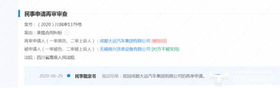 最后,据2020年6月的民事申请再审审查的民事裁定书显示,驳回再审申请人成都大运汽车集团有限公司的再审申请。