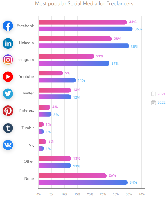 LinkedIn,Instagram和YouTube继续在自由职业者中获得知名度,成为自由职业者促进其作品的顶级平台。
