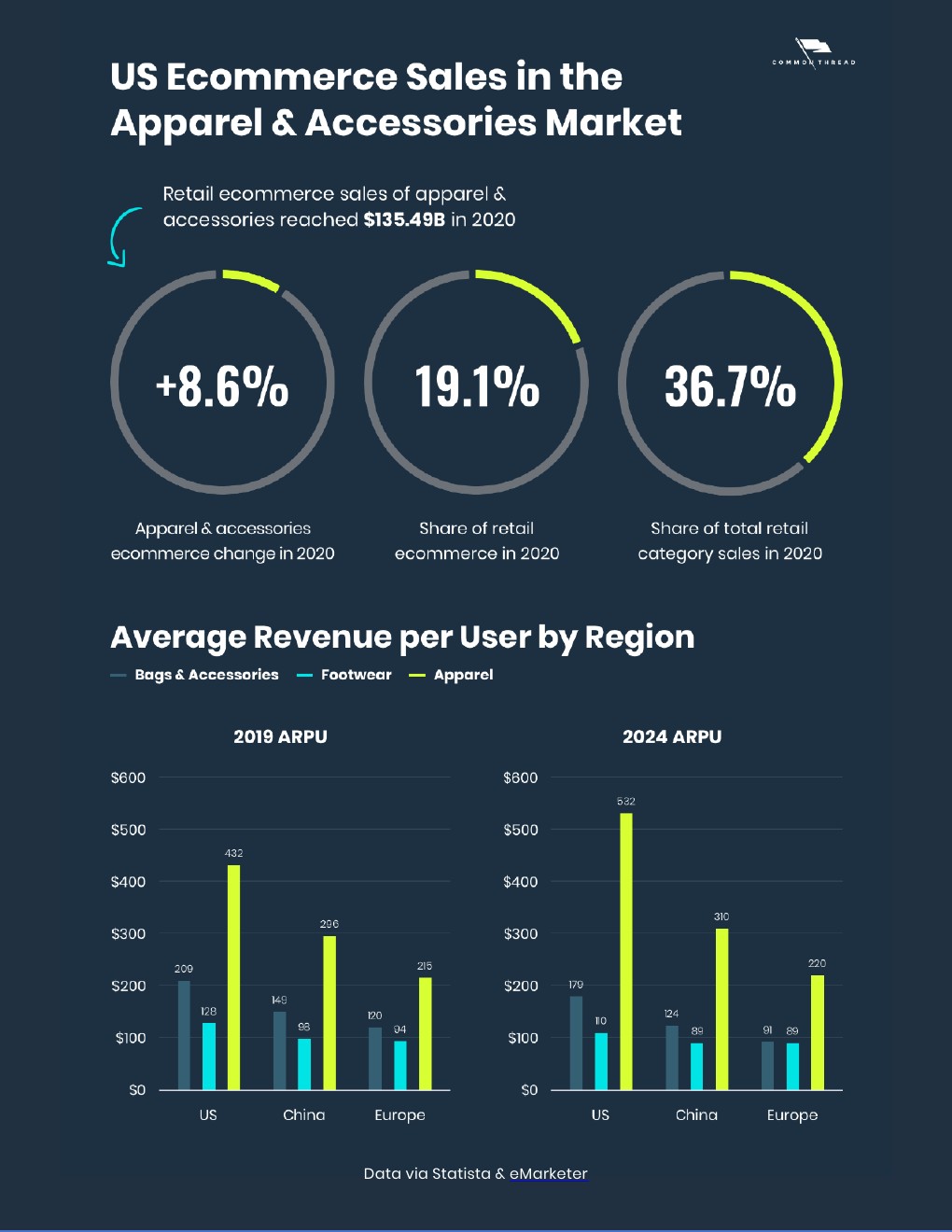 2021年,全球电子商务时装市场价值将达到7595亿美元,服装、配饰和鞋类是全球第一大电子商务分支行业。
