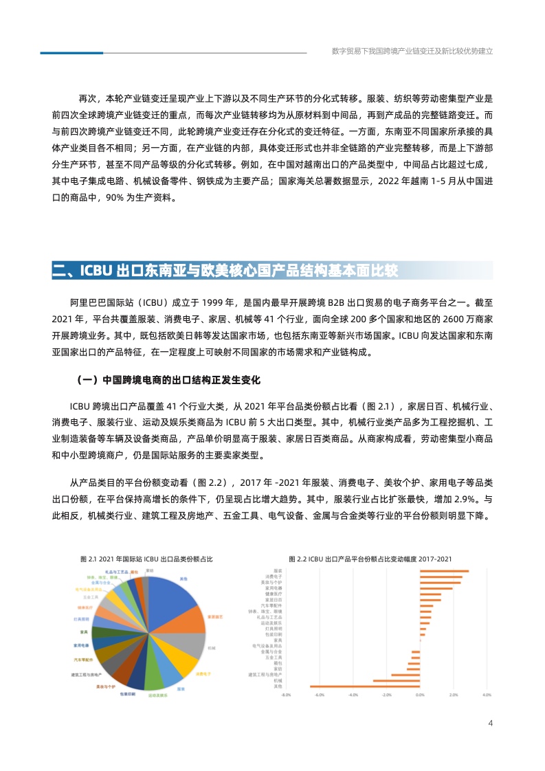 这份报告梳理了2019年至2022年阿里巴巴跨境电商平台(国际站)ICBU上服装、消费电子等重点行业上下游产品出口情况,分析全球跨境电商产业链发展的新特征和新趋势。通过行业协会、企业商户、业务调研座谈等方式,在全球数字贸易加速发展的时代背景下,梳理中国产业创新实践,探讨构建未来跨境产业链发展的新比较优势,助力“双循环”新发展格局和经济高质量发展。