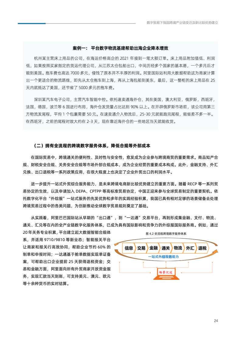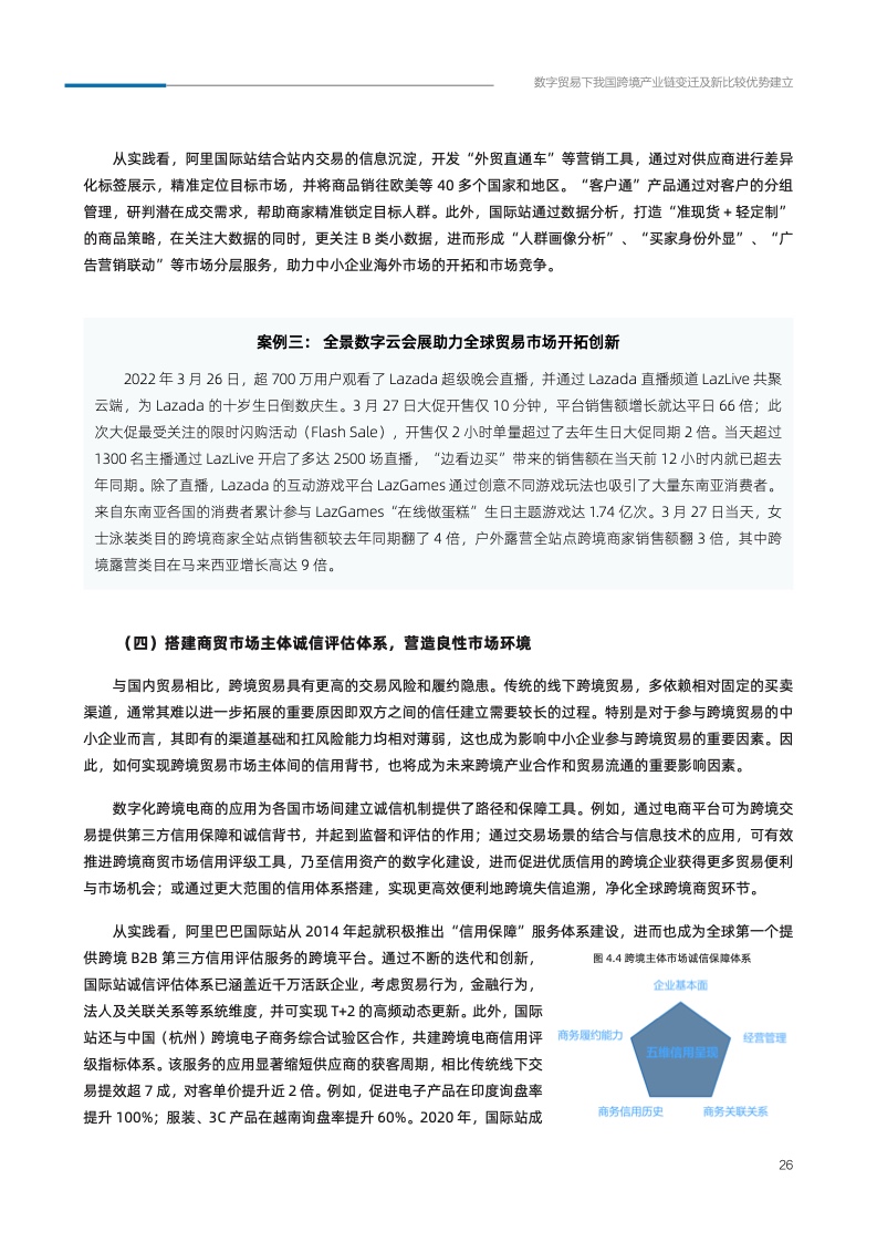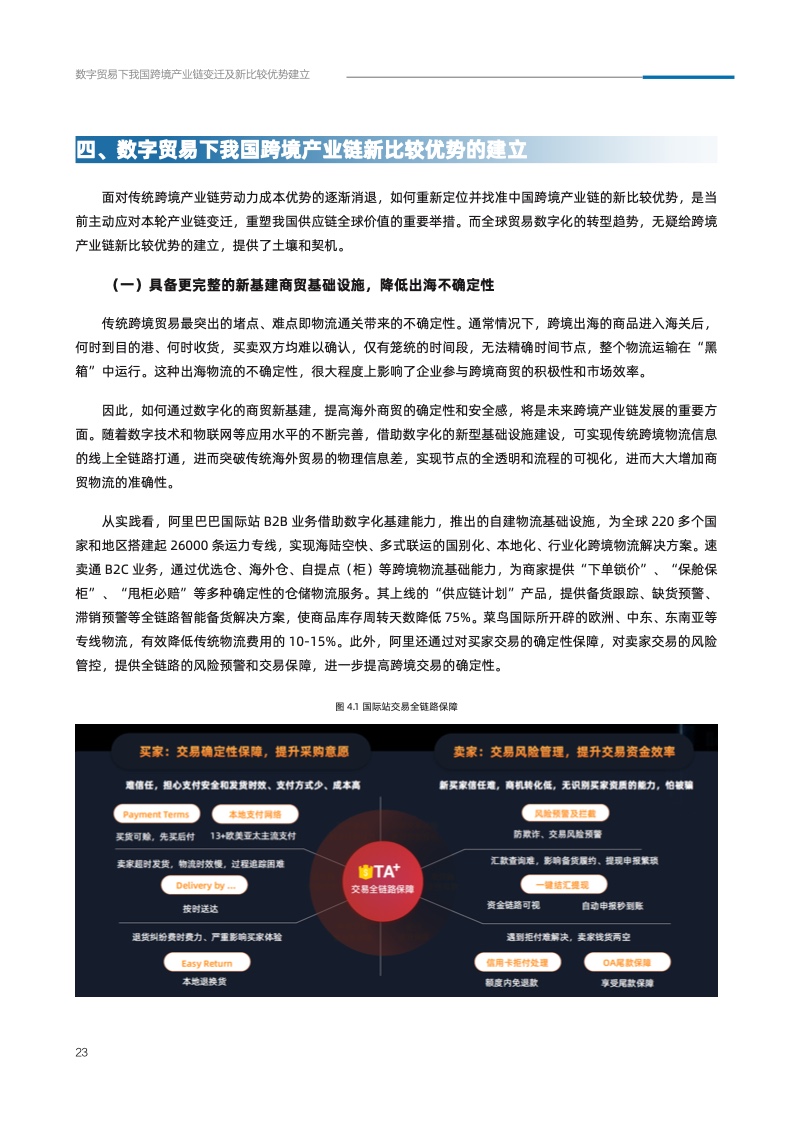 从实践看,以阿里国际站等代表的跨境平台,借助数字化基础能力的不同提高,不断深耕我国数字时代跨境贸易的新比较优势。例如,阿里巴巴际站通过自建物流基础设施,为全球220多个国家和地区搭建起26000条运力专线;速卖通B2C业务,为商家提供“下单锁价”、“保舱保柜”、“甩柜必赔”等多种确定性的仓储物流服务,大幅降低商品库存的周转天数%;“一达通”通过建立大数据智能合规体系和智能报关平台,显著帮助企业节约制单和申报时间;国际站“客户通”、“外贸直通车”等产品,更加关注B类小数据,助力中小企业拓展海外市场;搭建的“信用保障”服务体系,增加了跨境买家的询盘率和客单价;此外,阿里国际站还通过打造星级供应链成长体系,聚焦商家快速响应与质优价廉的产业供给优势,做厚商家贸易价值。