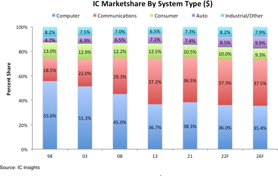 IC Insights发布了第三季度更新,包括美洲、欧洲、日本、中国和亚太地区的消费者、汽车、计算机、工业、通信和政府/军事终端应用的IC市场。