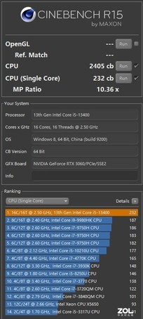 CINEBENCH测试标准下,CINEBENCH R15多核2405cb、单核232cb;CINEBENCH R20多核5858cb、单核613cb;CINEBENCH R23多核15114pts、单核1597pts。从评分同样可以看出,酷睿i5-13400提升的主要是其多核性能。