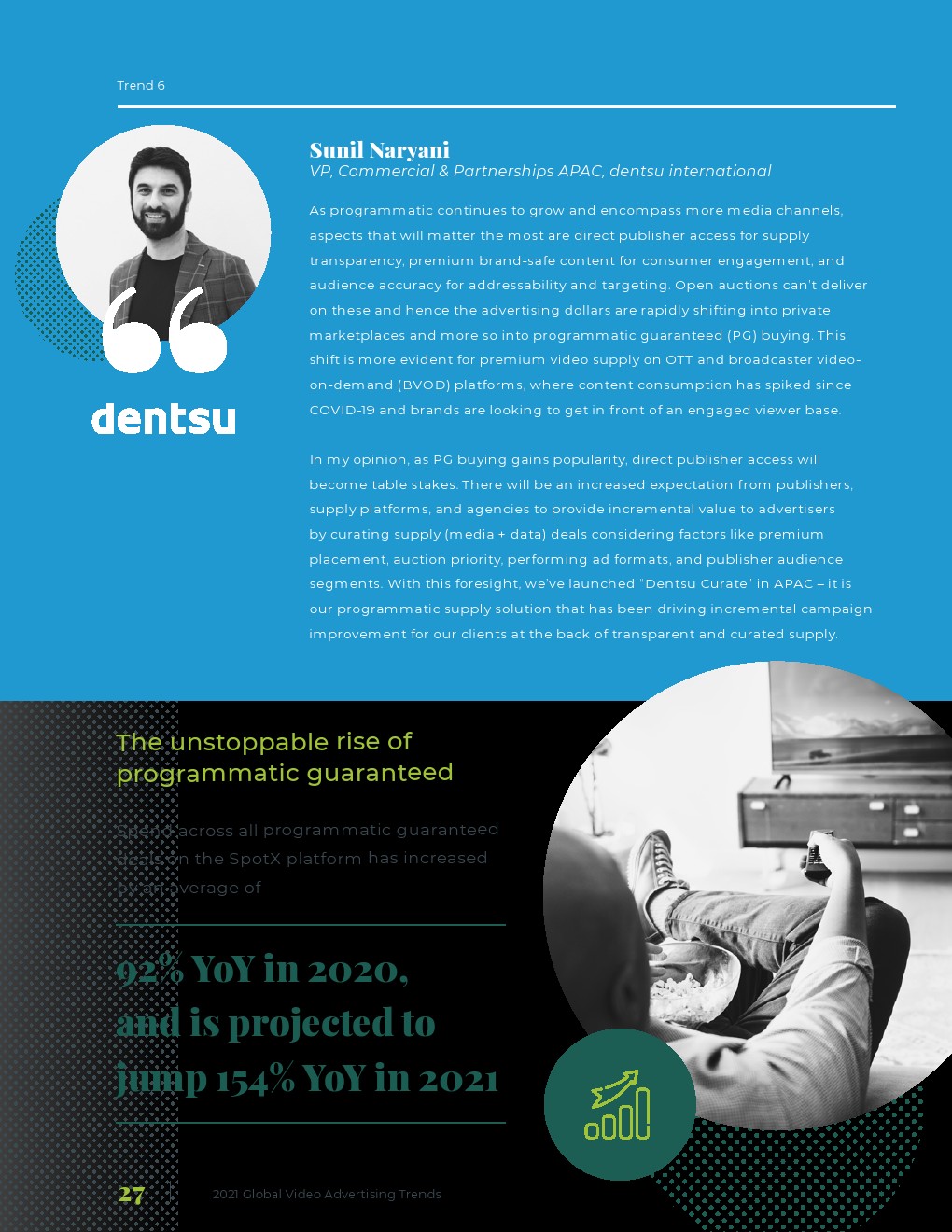 消费者观看习惯的加速转变将加速后有线电视生态系统的发展。广告支出遵循新的消费者习惯,流向OTT和CTV的速度比预期更快。设备制造商拥有建立广告业务,增加市场份额并影响收视体验的新机会。有了广告程序化购买,可寻址电视就可以扩展规模了。随着对准确性和可测量的关注更多,数据分层广告系列将继续变得更加流行。预计广告程序化购买会激增。买卖双方将更加全面地评估合作伙伴。