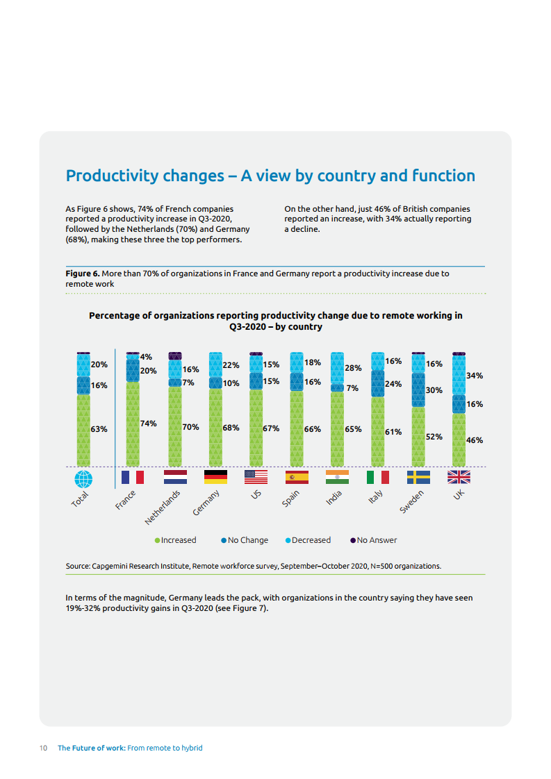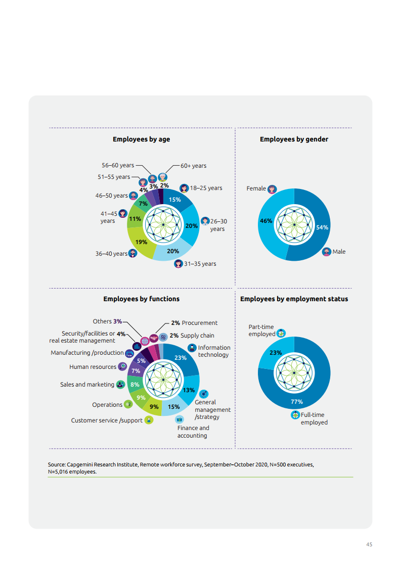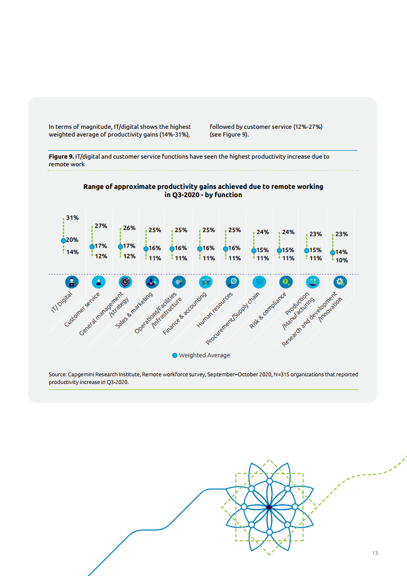 2020年第三季度,归因于通勤时间减少、灵活的工作安排以及有效虚拟合作工具的使用,企业员工的工作效率提升了63%。工作内容与IT和数字功能相关的员工,其效率提升最大(68%),其次是客户服务(60%)和市场营销(59%)。数字化和诸如人工智能(AI)等技术的使用帮助企业在这些领域提升工作工作效率。工作效率数字化和人工智能(AI)等技术的使用帮助组织看到了这些领域生产力的提高。涉及更多内部工作和更高比例蓝领工人的职能部门,如生产/制造、研发/创新和供应链等部门,在工作效率提高的企业中所占比例最低(低至51%)。
