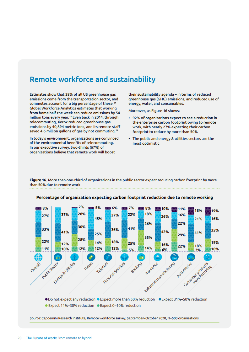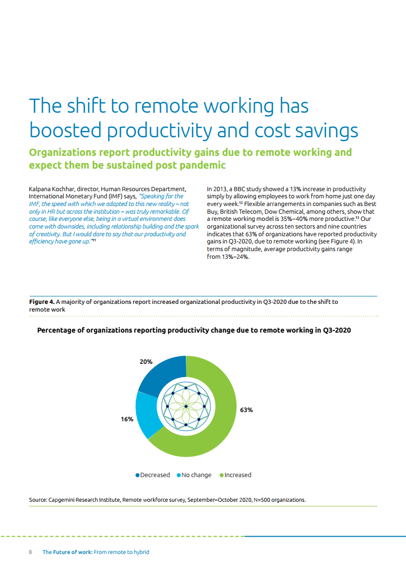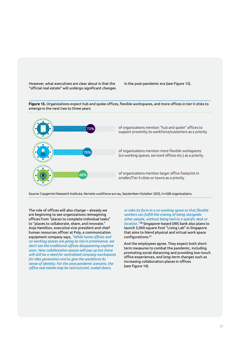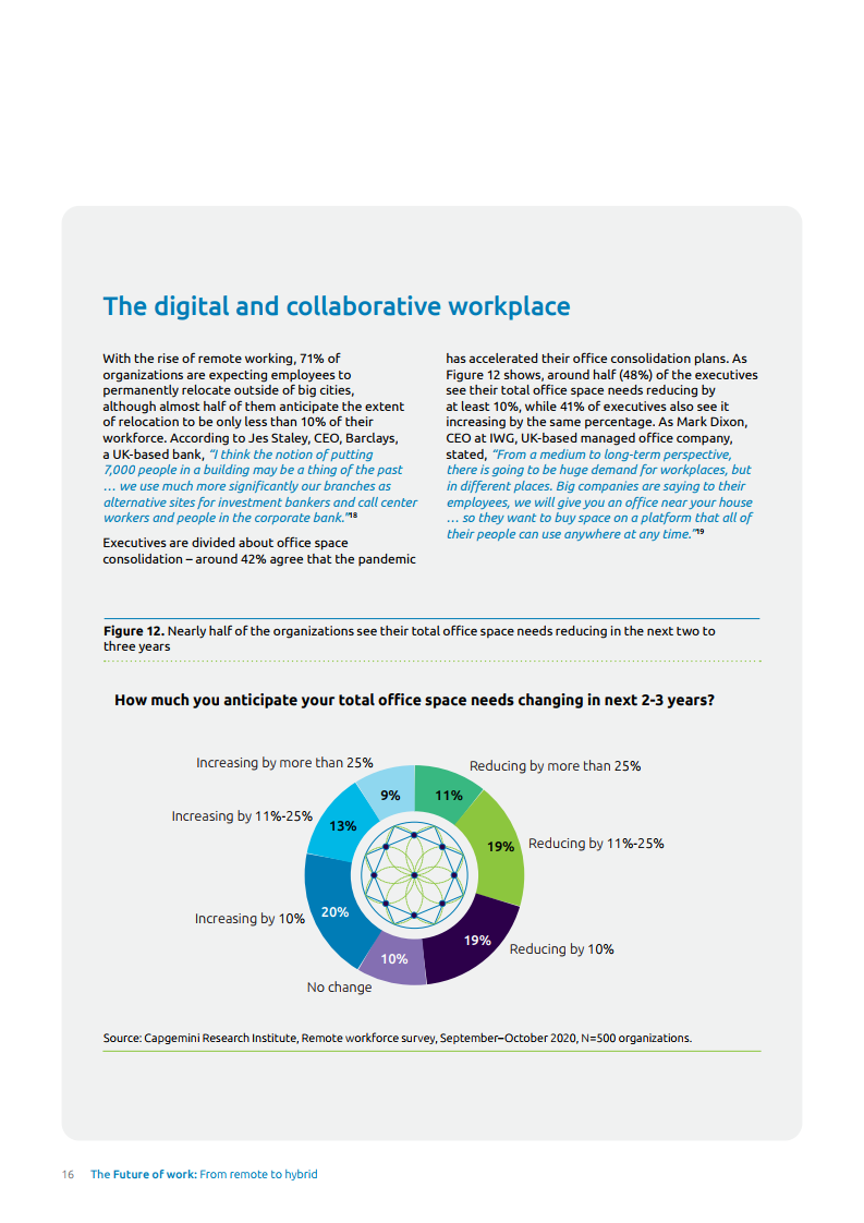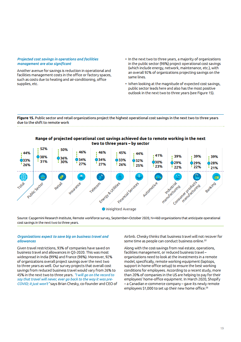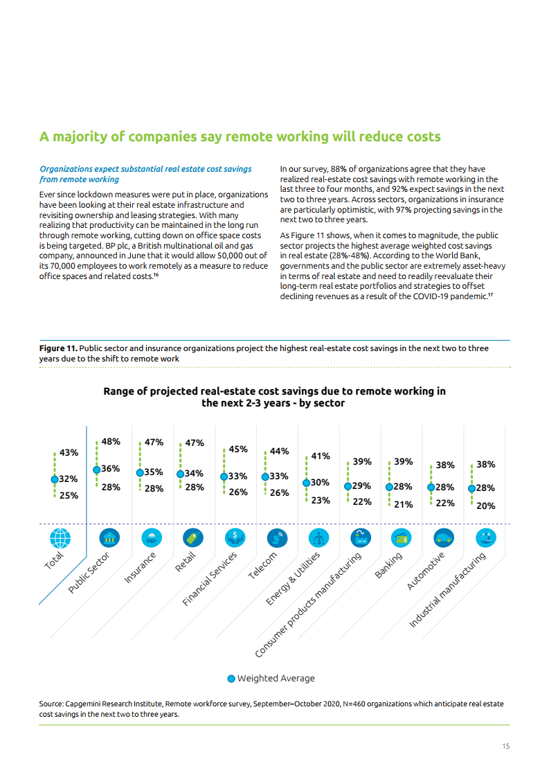 报告中各企业预计在未来两到三年内整体工作效率将提升17%。此外,88%的人在过去三到四个月内通过远程工作实现了租房成本的节约,92%的人预计在未来两三年内可以节省成本。