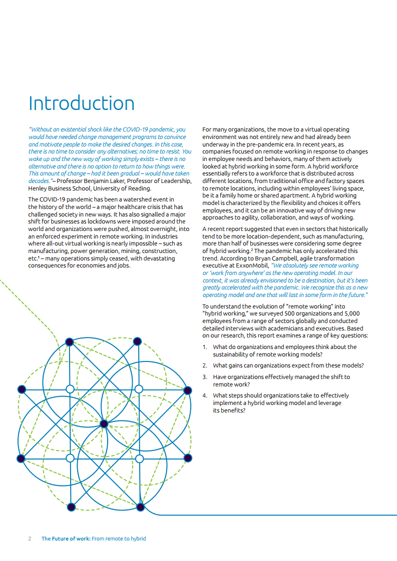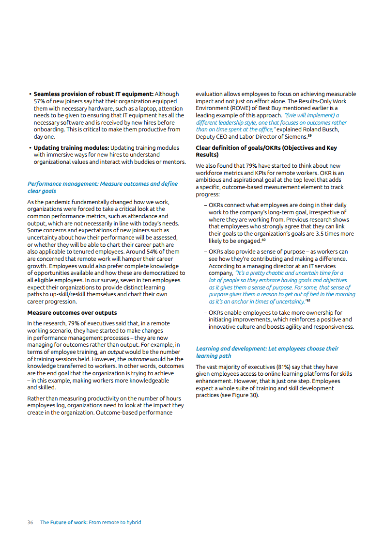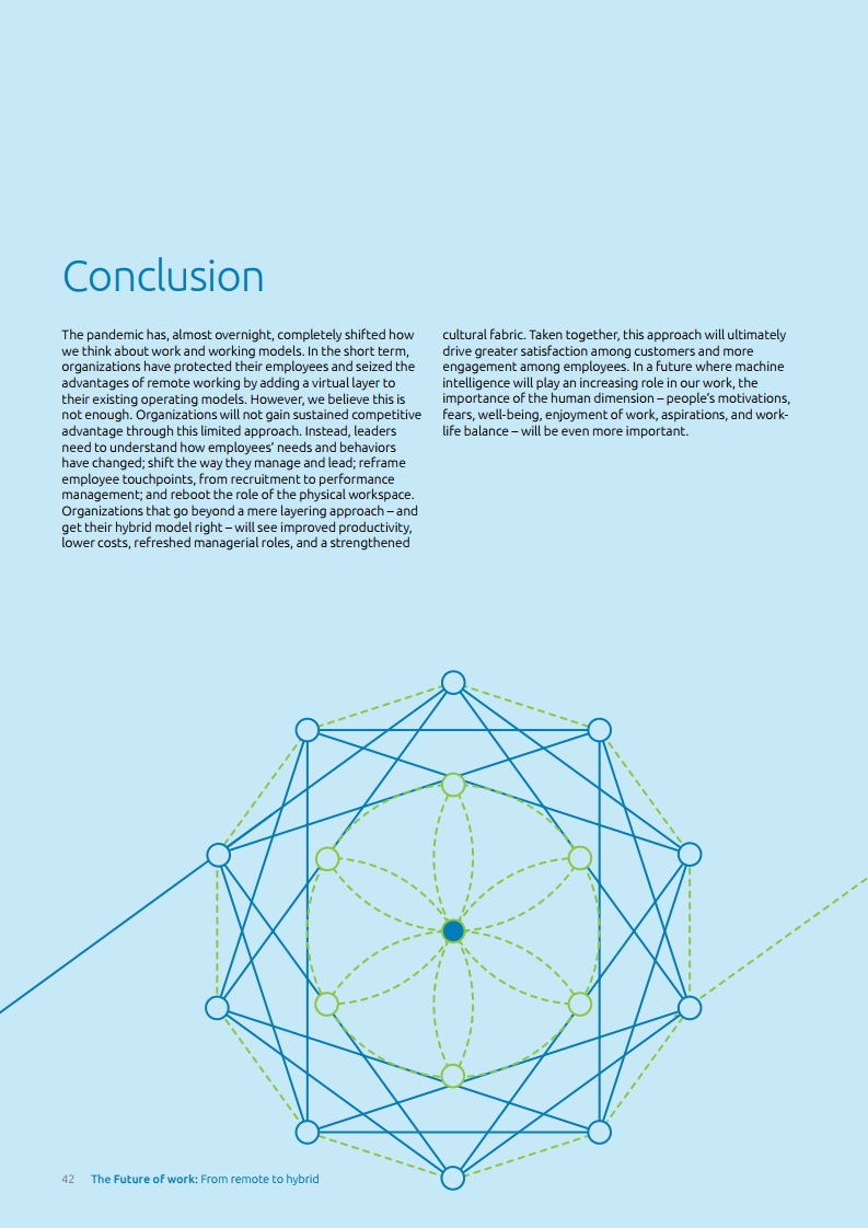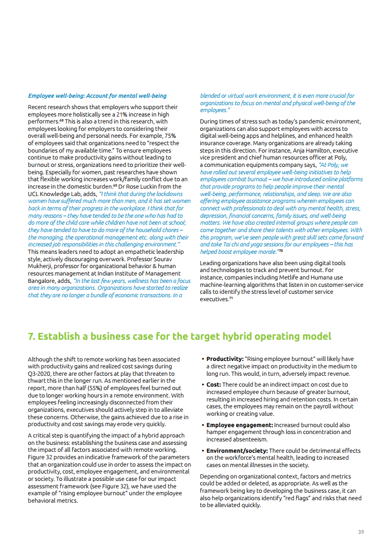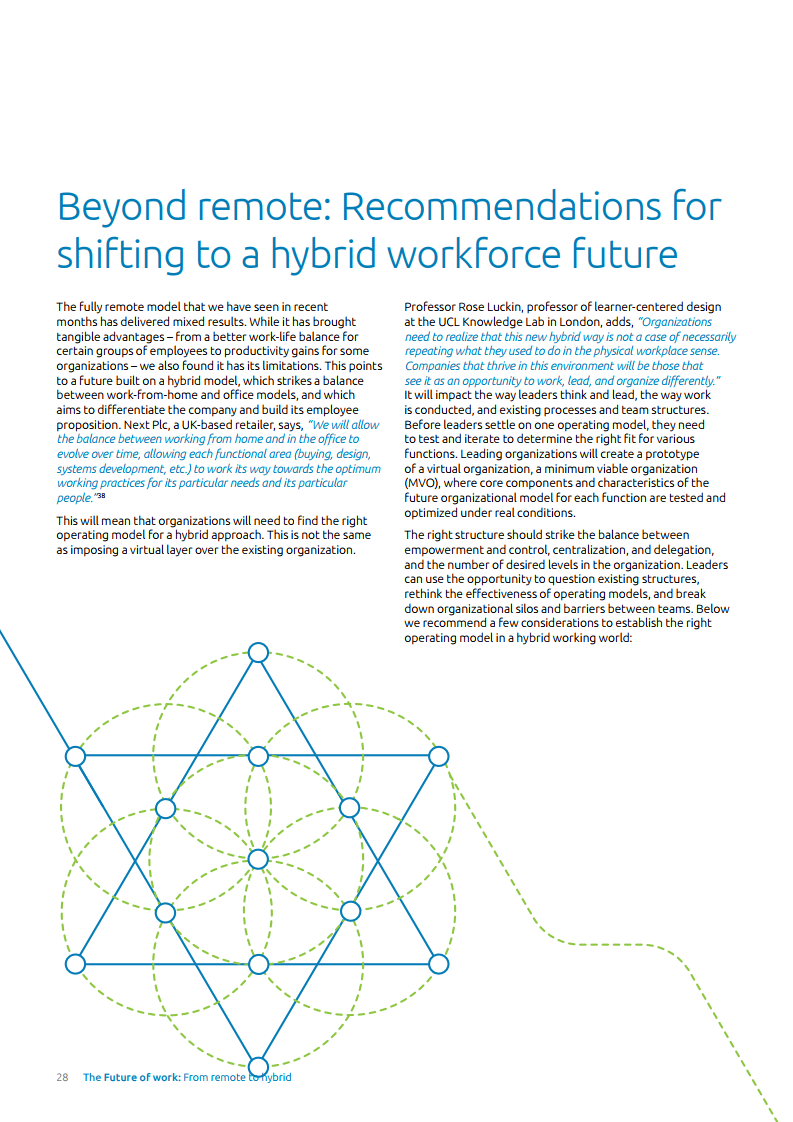 为了继续受益于远程工作并管理员工预期,企业需要找到一种正确操作模式以实现更平衡的混合式工作方法。报告中提到,为了实现这个目标,管理层需要质疑、重新思考现存框架的有效性,并解决组织壁垒和团队障碍。