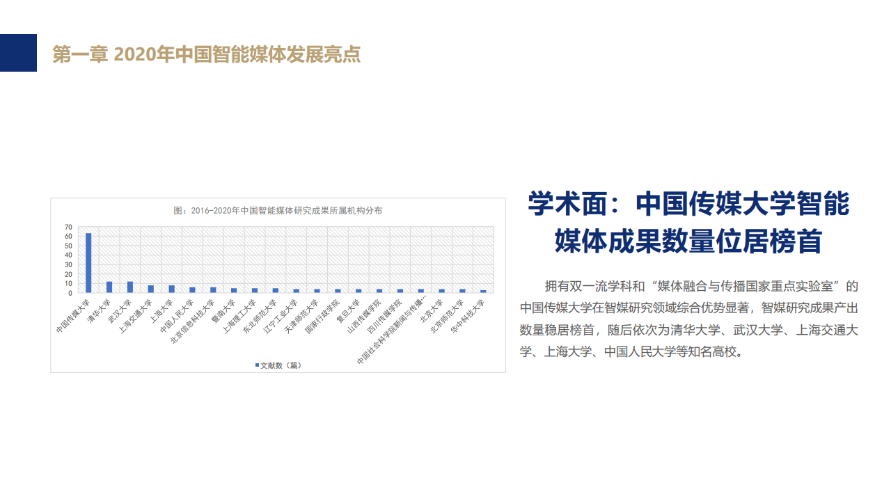看点5:2020年国内智媒研究量质齐升,中国传媒大学智媒成果产出位列榜首。当下智媒研究诠释转向和思辨转向显现,研究主题集中在智媒生态、传统媒体智能化路径与模式、智媒发展内在逻辑、新型人机关系、智媒伦理等方面。