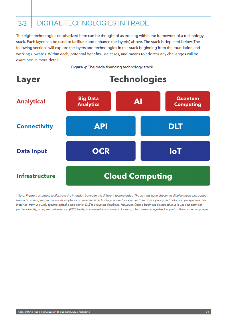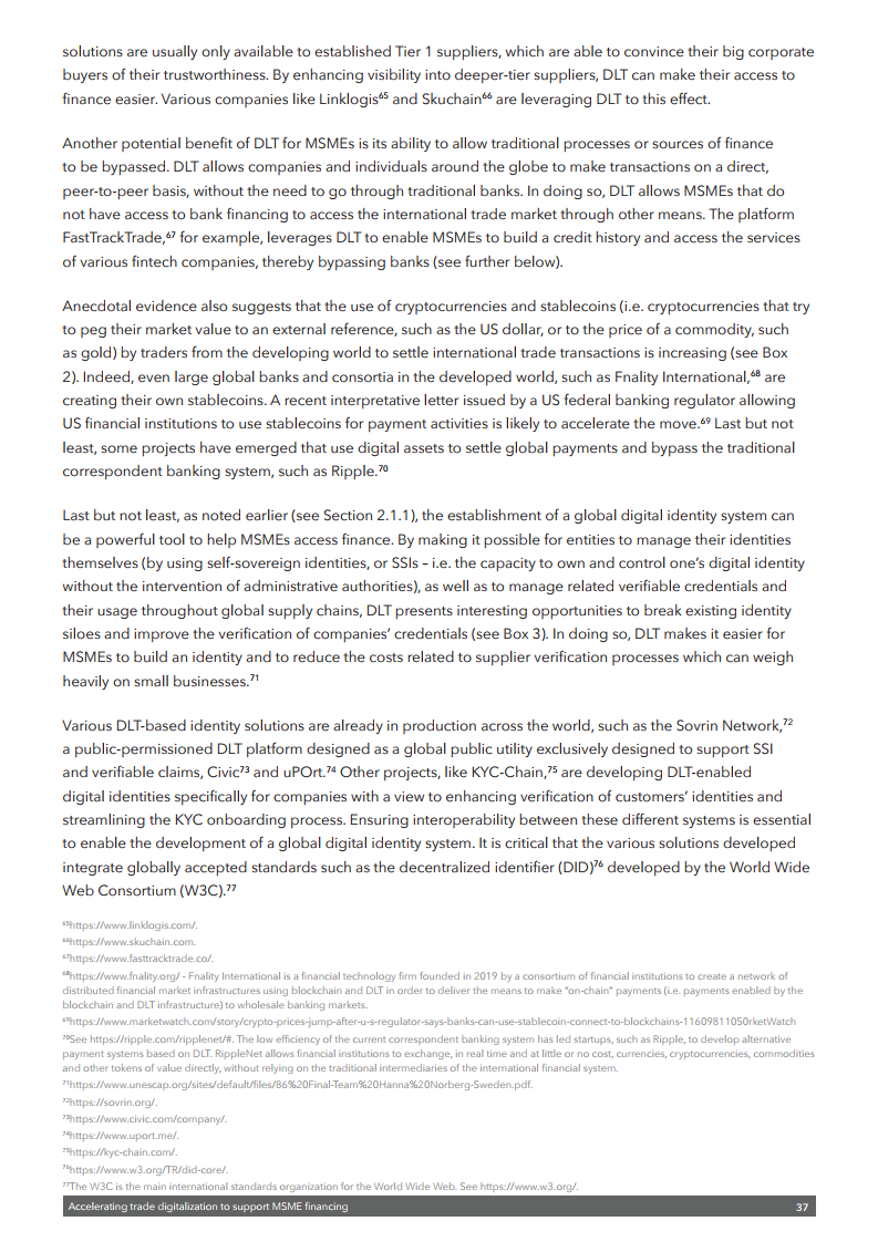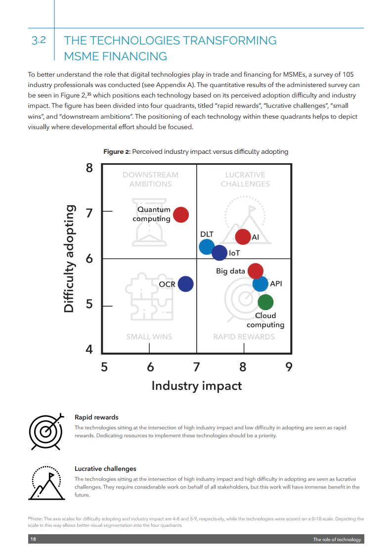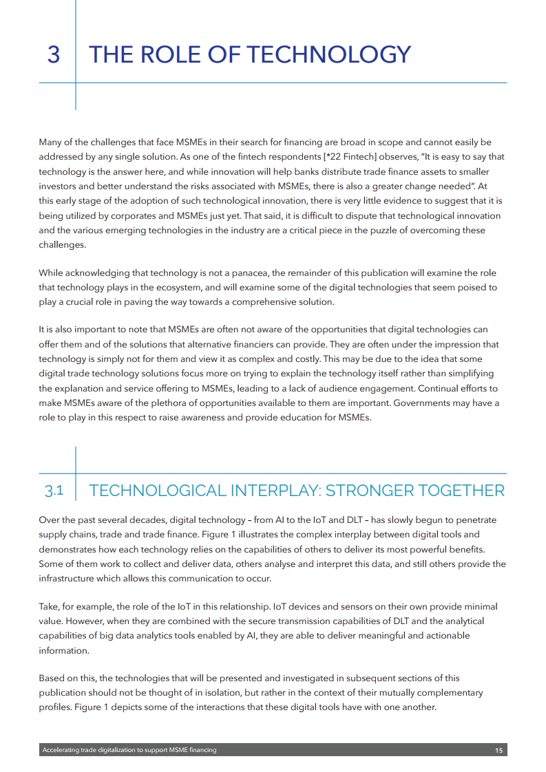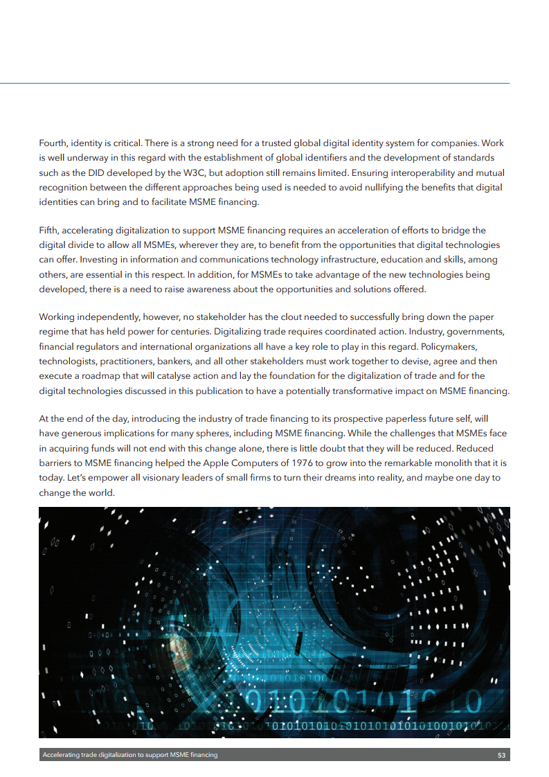 该出版物强调需要采取多管齐下的方法来释放数字技术的潜力,以促进中小企业融资。这包括需要制定全球公认的标准以及利用数据更好地评估融资风险的通用框架。还需要一个能够识别电子签名和电子文件并符合《贸易法委员会电子可转让记录示范法》的扶持性监管框架。还需要为公司建立一个可信的全球数字身份系统。