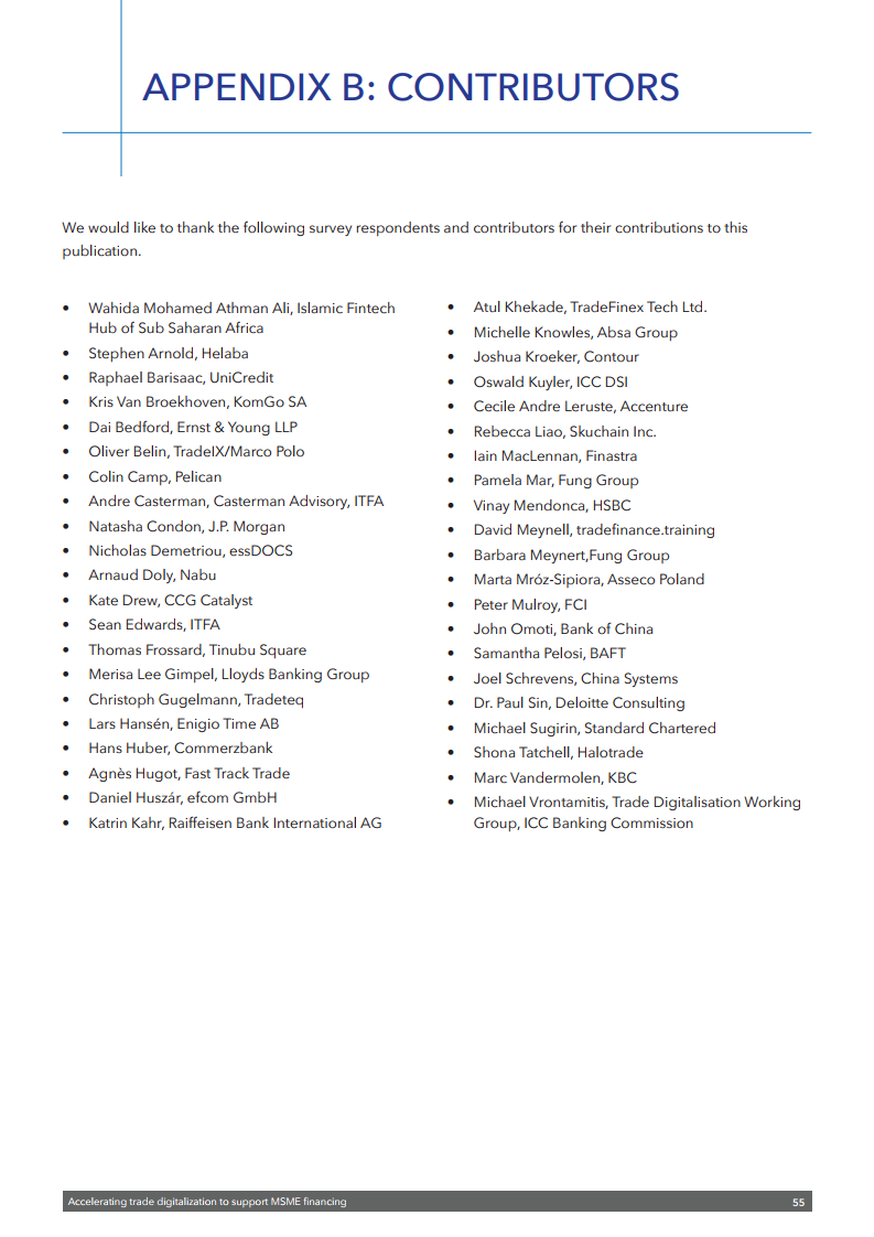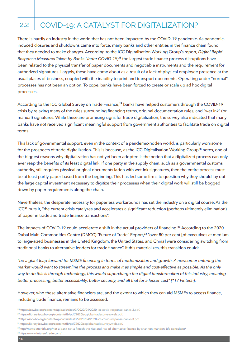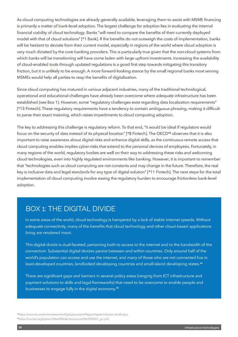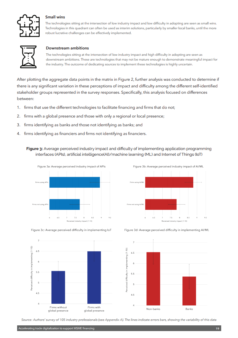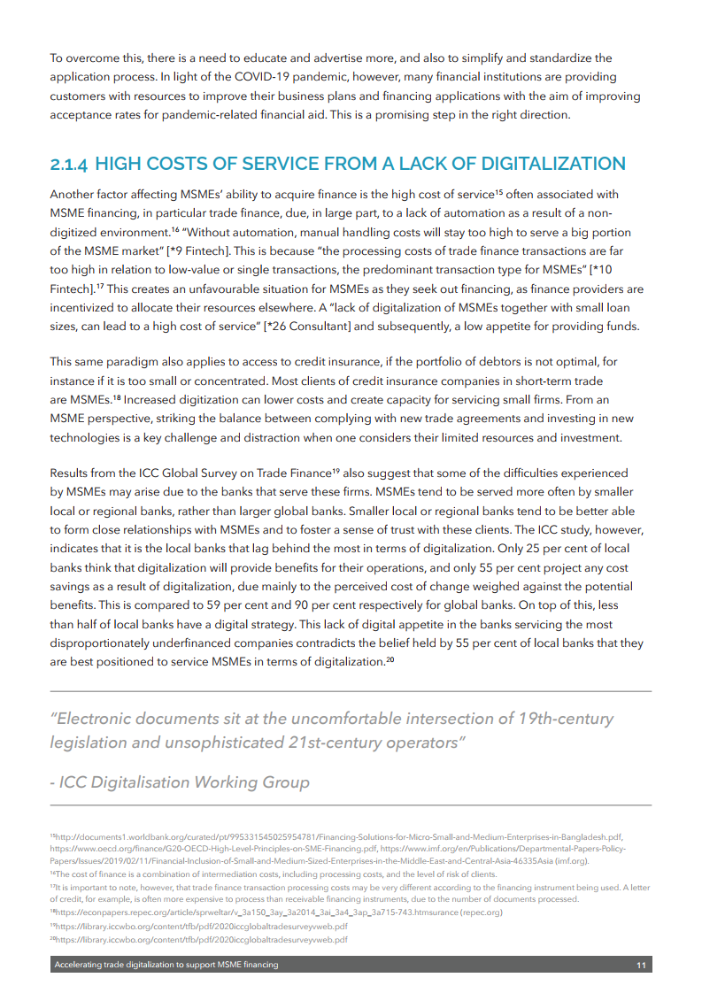 该出版物强调需要采取多管齐下的方法来释放数字技术的潜力,以促进中小企业融资。这包括需要制定全球公认的标准以及利用数据更好地评估融资风险的通用框架。还需要一个能够识别电子签名和电子文件并符合《贸易法委员会电子可转让记录示范法》的扶持性监管框架。还需要为公司建立一个可信的全球数字身份系统。