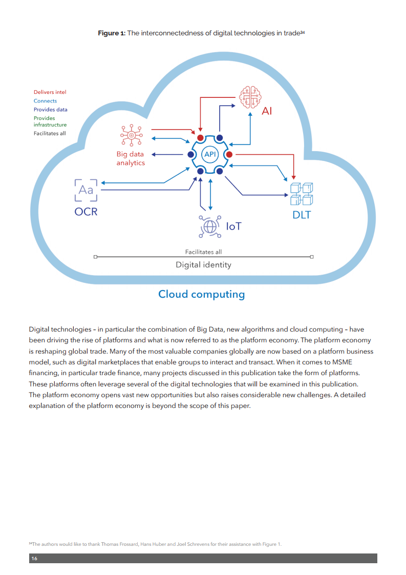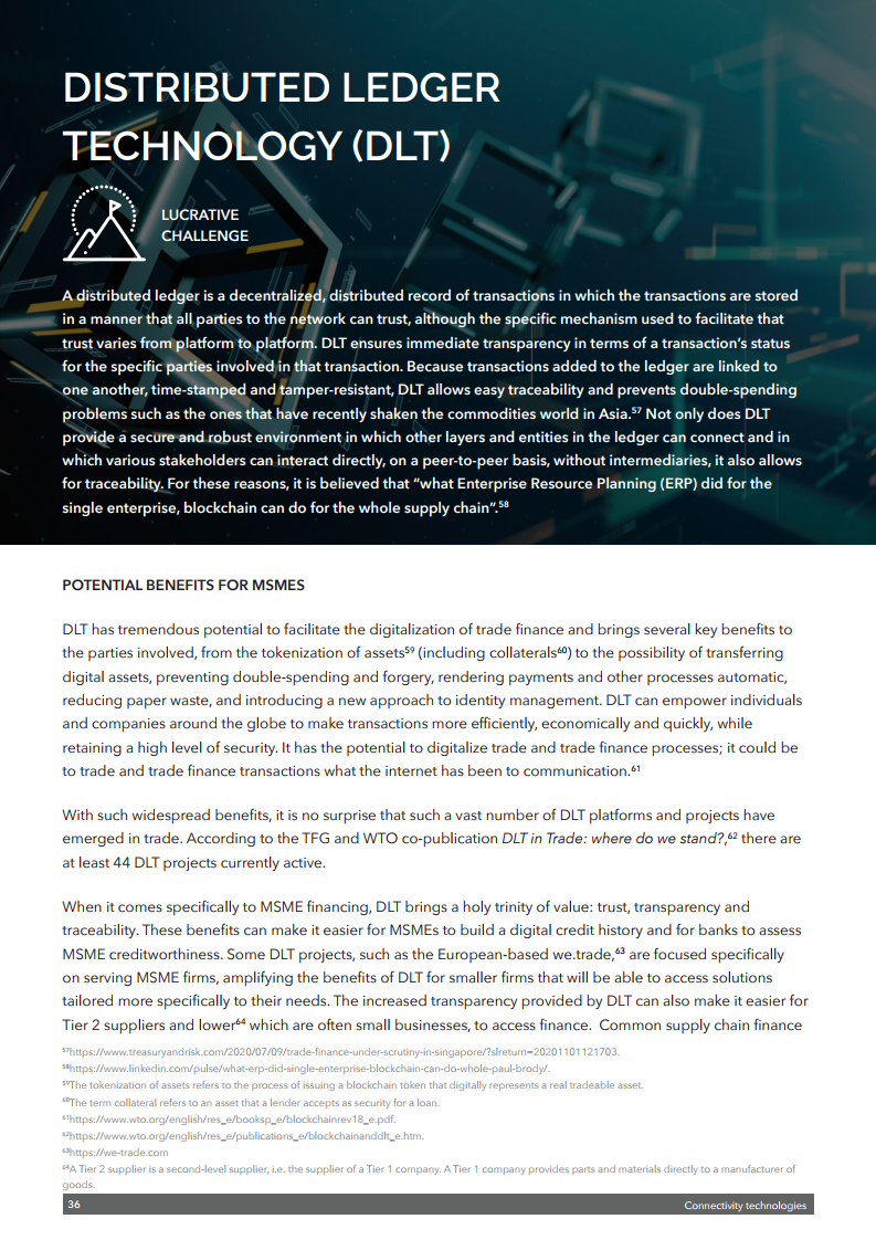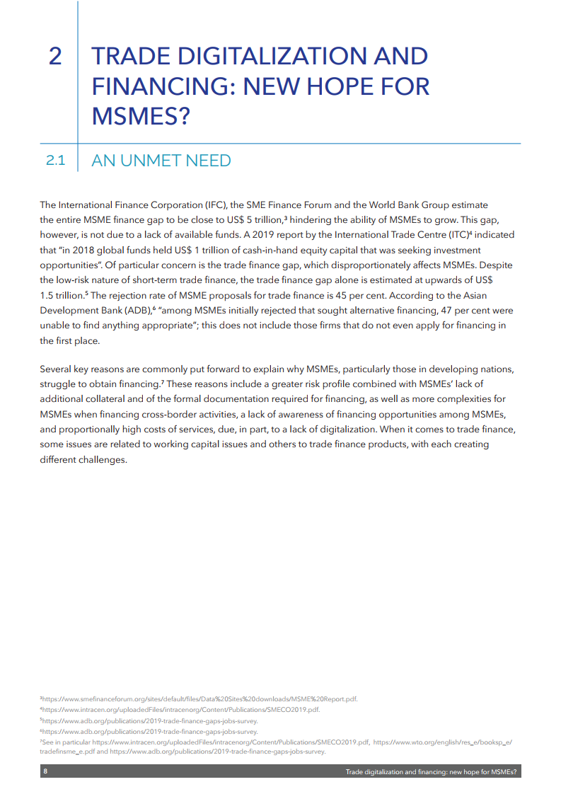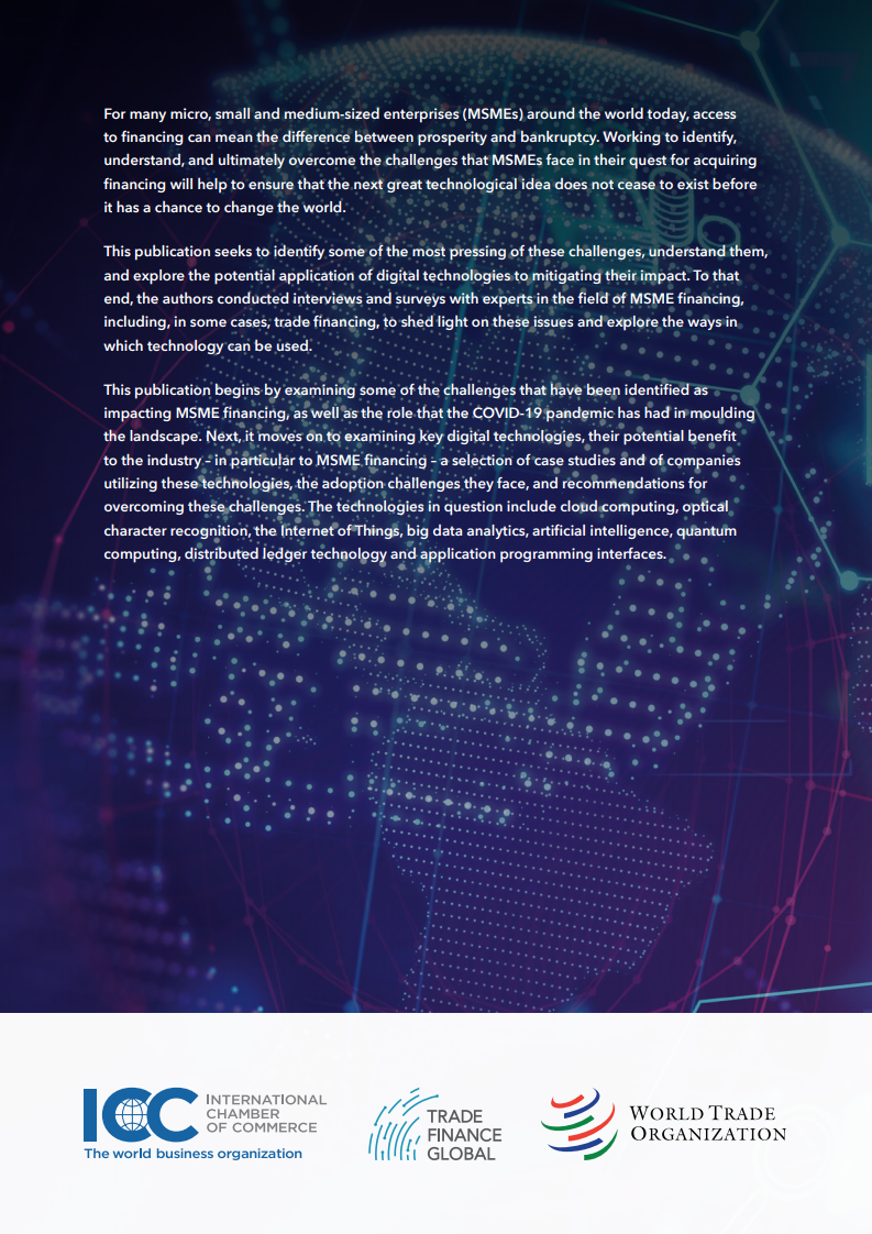 在近日举行的区块链论坛上,WTO推出了最新出版物《加快贸易数字化以支持中小企业融资》,旨在确定与微型、小型和中型企业(MSMEs)贸易融资相关的一些最紧迫的挑战,并探讨数字技术在应对这些挑战方面的潜在应用。该出版物基于对中小微企业融资领域(包括贸易融资)专家的采访和调查,并探讨了利用技术改善融资渠道的方法。