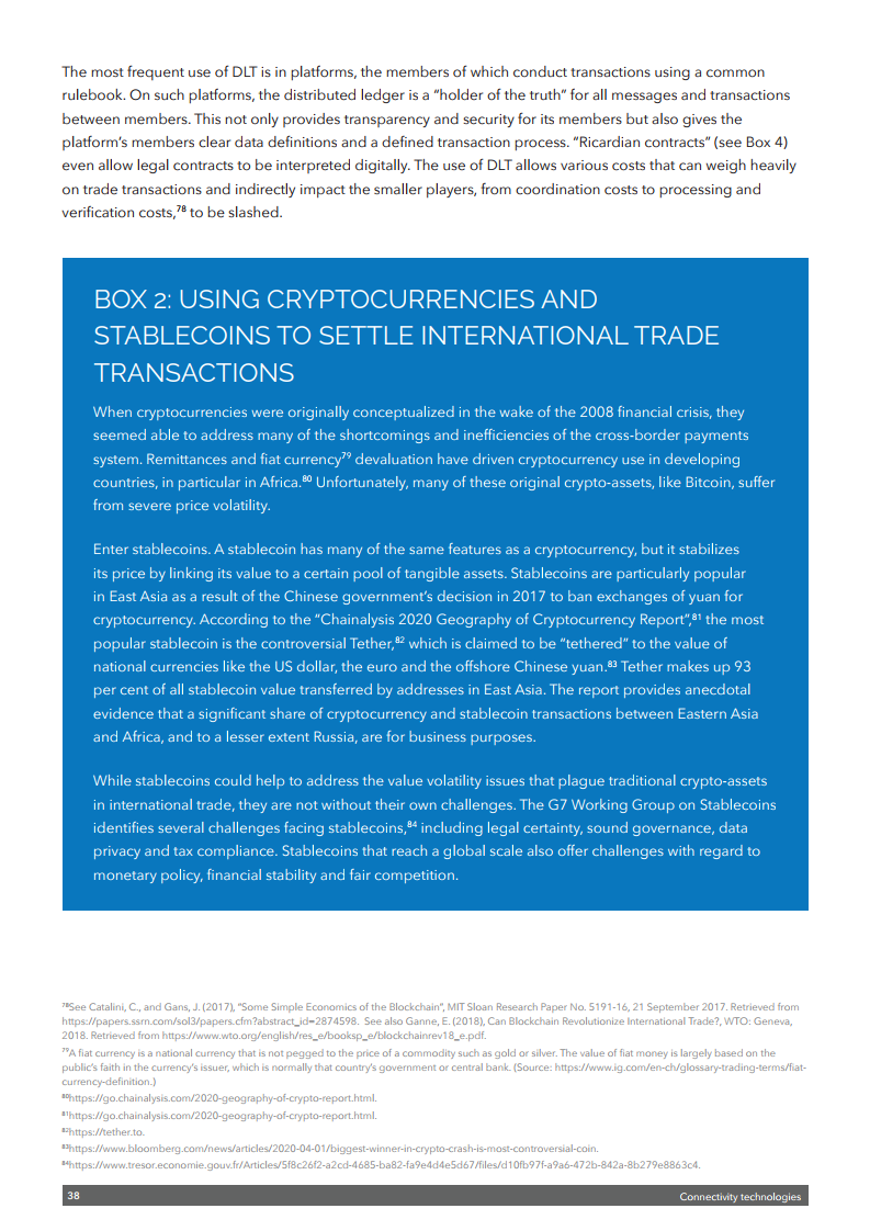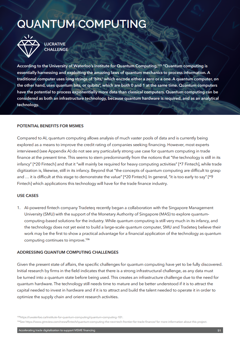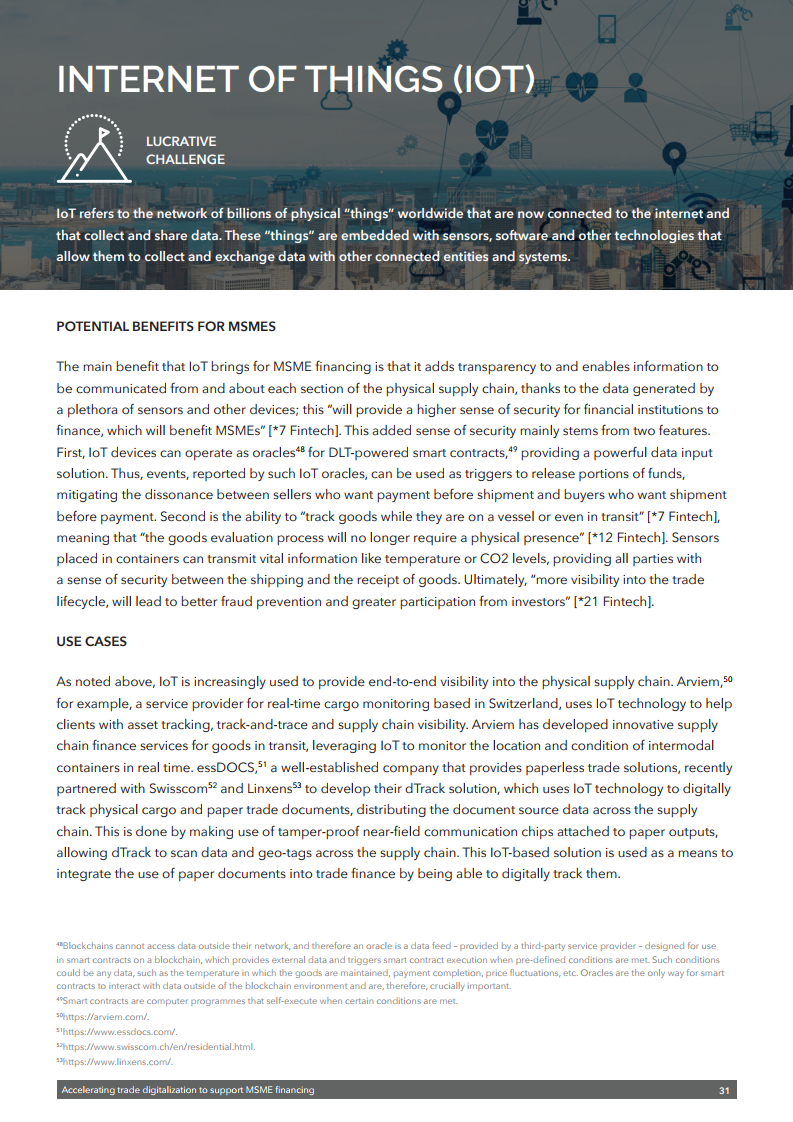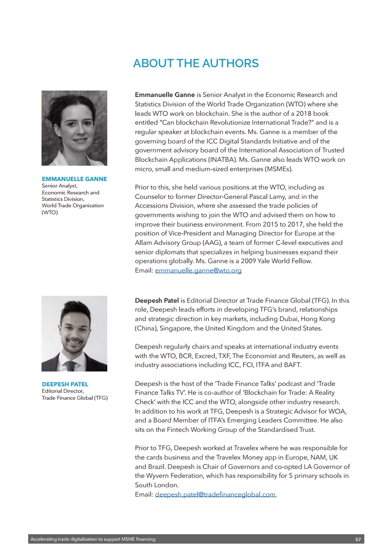 在近日举行的区块链论坛上,WTO推出了最新出版物《加快贸易数字化以支持中小企业融资》,旨在确定与微型、小型和中型企业(MSMEs)贸易融资相关的一些最紧迫的挑战,并探讨数字技术在应对这些挑战方面的潜在应用。该出版物基于对中小微企业融资领域(包括贸易融资)专家的采访和调查,并探讨了利用技术改善融资渠道的方法。