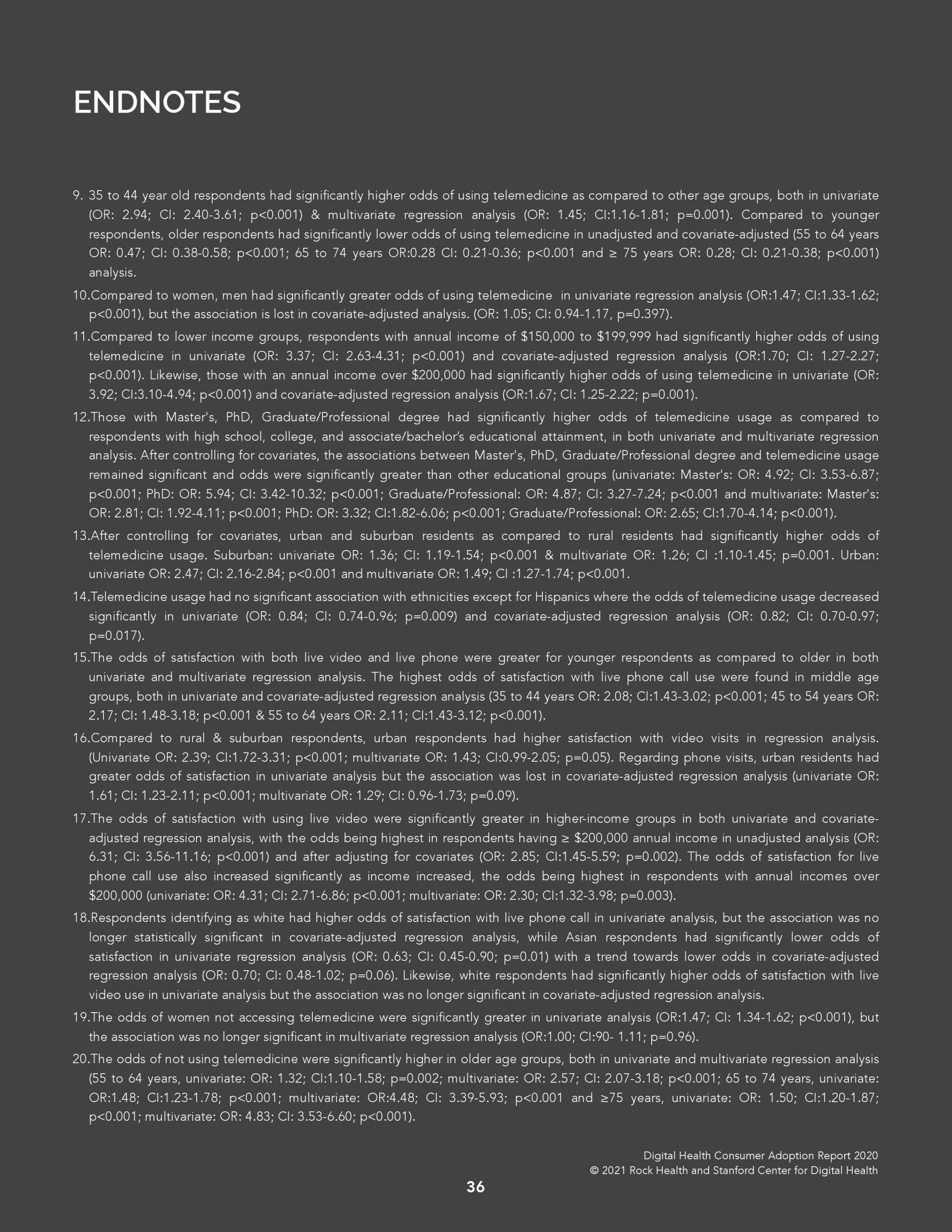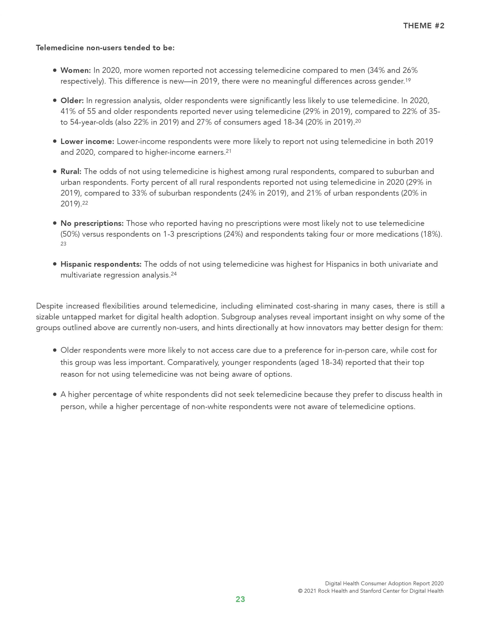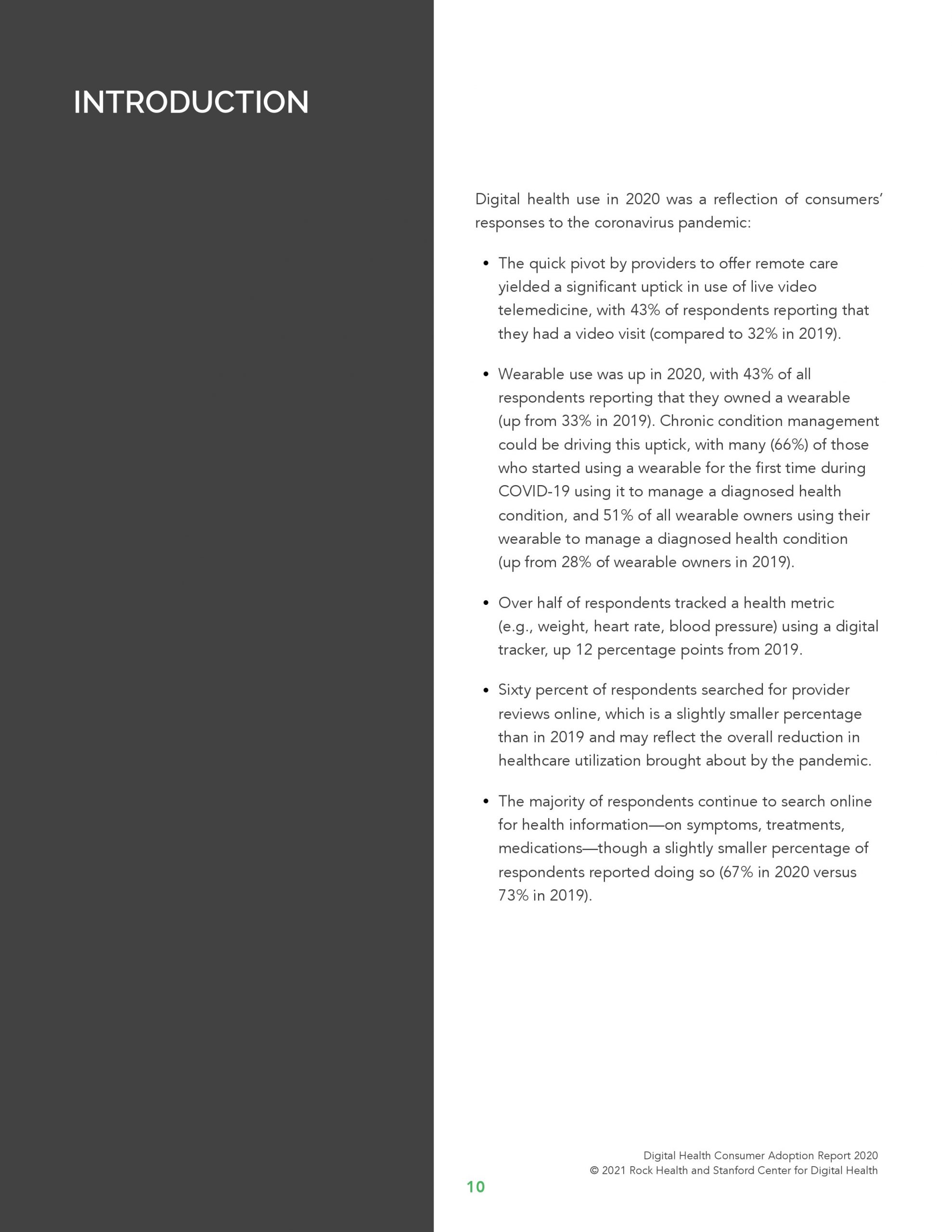 提供商提供远程护理的快速枢纽使视频远程医疗的使用率显著上升,43%的受访者进行过视频就诊(相比之下,2019年为 32%)。可穿戴设备的使用在2020年有所上升。43%的受访者拥有可穿戴设备 (高于2019年的33%)。慢性疾病管理可能会推动这一上升趋势。在COVID-19期间首次使用可穿戴设备的受访者中有许多人(66%)使用其来管理健康状况。51%的可穿戴设备用户使用其来管理健康状况(高于2019年的28%)。超过一半的受访者使用数字跟踪器追踪健康指标,如体重、心率、血压,比2019年上升了12个百分点。60%的受访者在网上搜索医疗机构评论,这一比例比2019年略低,可能反映出大流行带来的医疗保健使用率的总体下降。大多数受访者继续在网上搜索有关症状、治疗和药物信息,但这样做的受访者比例有所下降(2020年为67%,2019年为73%)。
