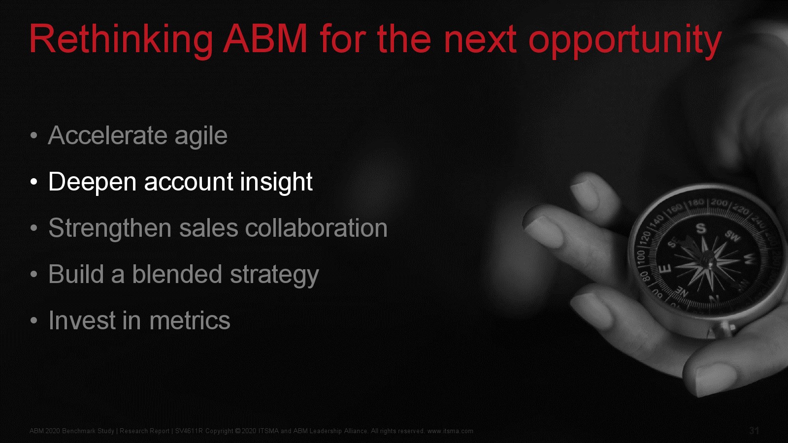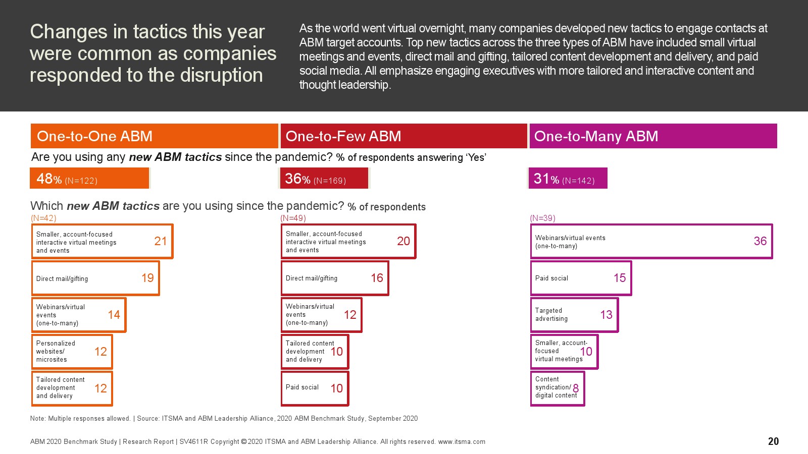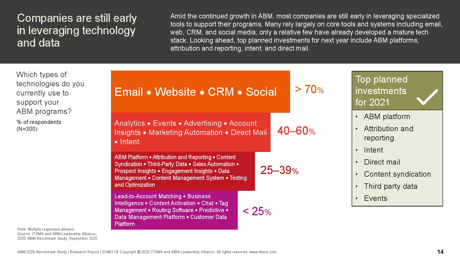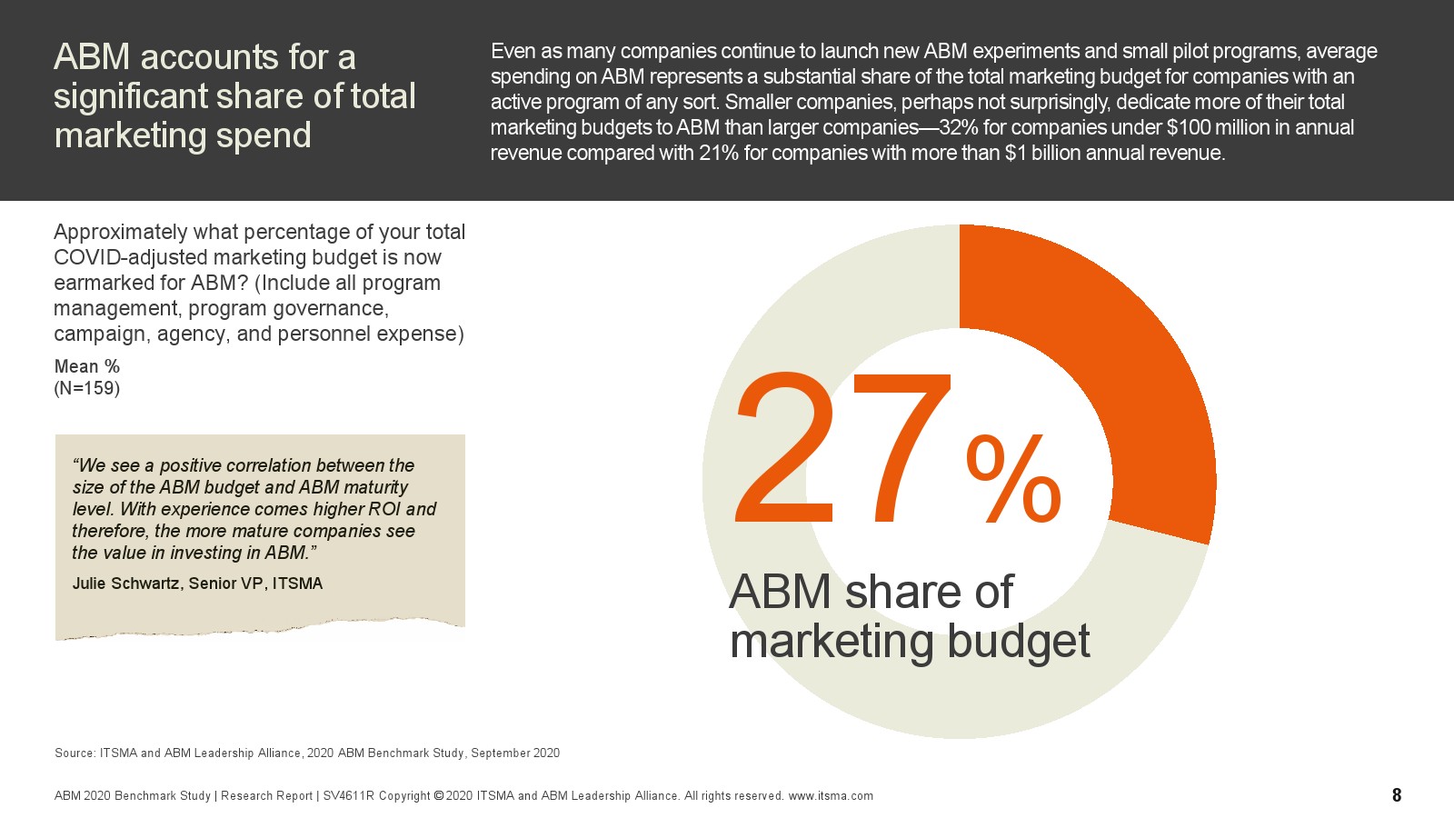 根据ITSMA和ABM发布的2020年ABM报告“重新思考ABM的下一个机会”,公司正在继续投资ABM(基于账户的市场营销),平均27%的营销预算专门用于这一策略。