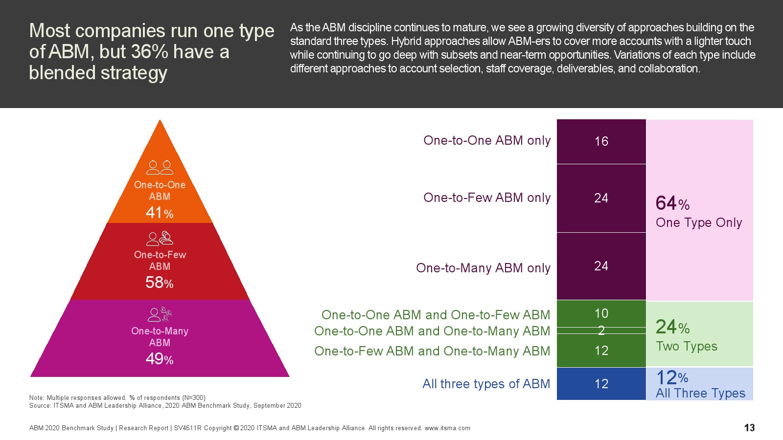 自21世纪初创立以来,ABM专注于针对现有客户的一对一营销,现已演变为一种拥有多种方法的策略。根据这项研究,这些方法仍然被定义为一对一,一对少和一对多。大多数受访者(64%)表示,他们的公司使用单一类型的ABM,其中最受欢迎的联合策略是一对少(24%)和一对多(24%)。