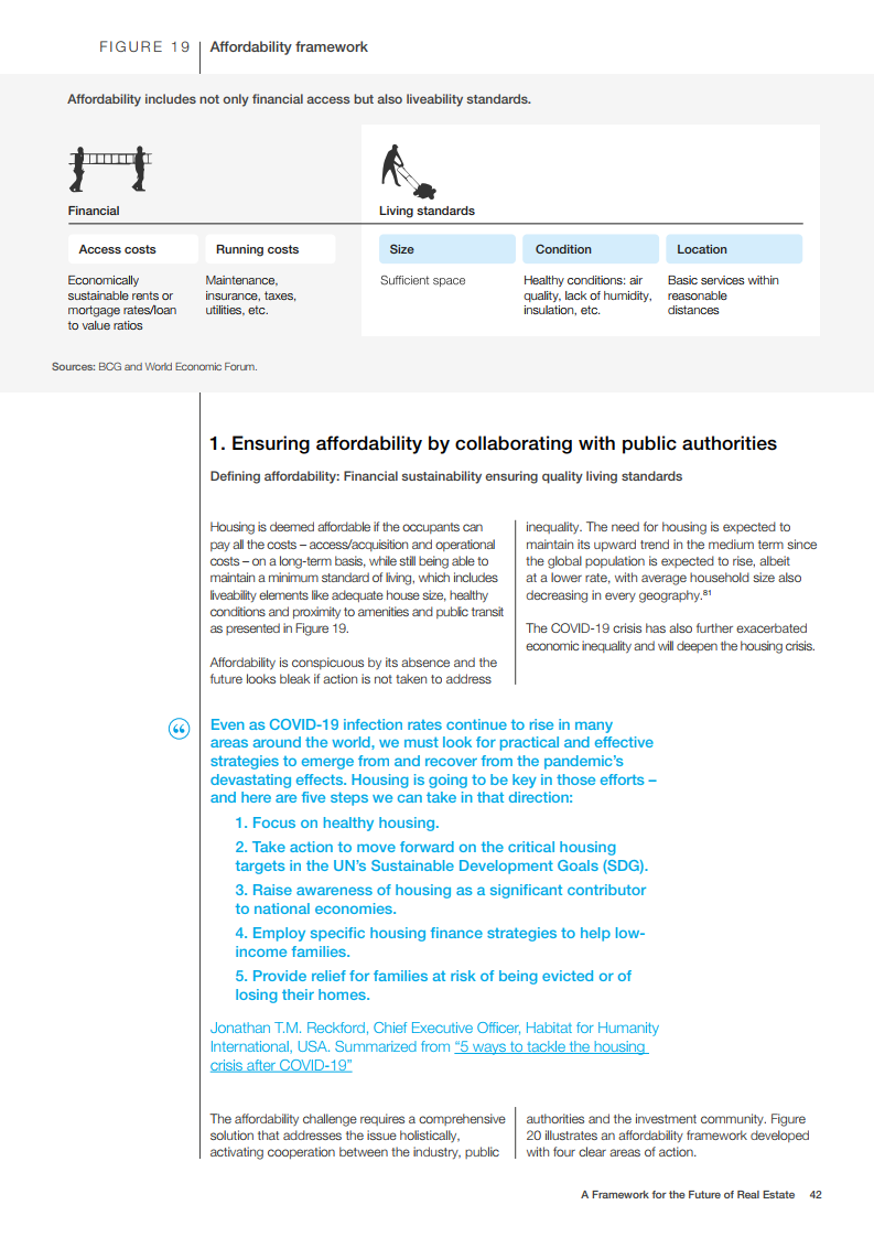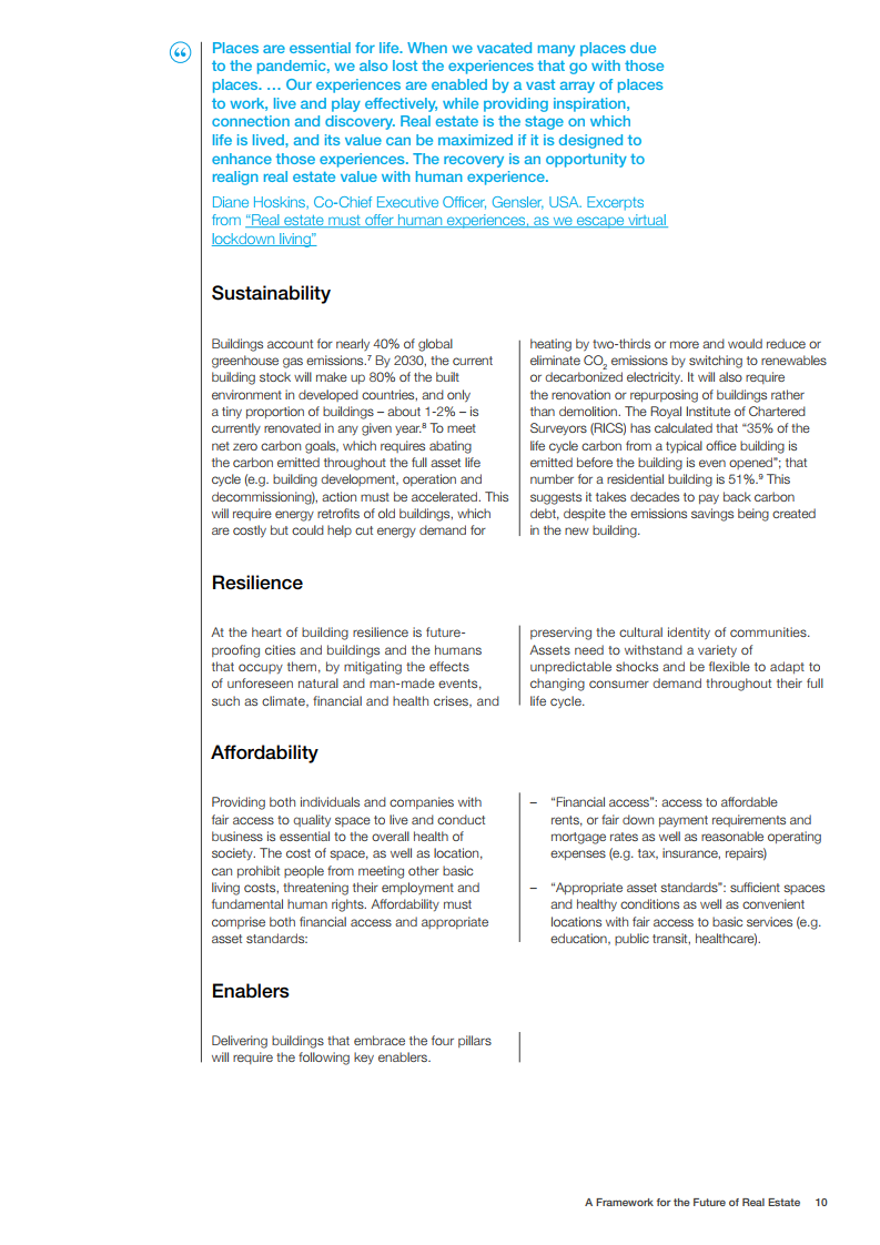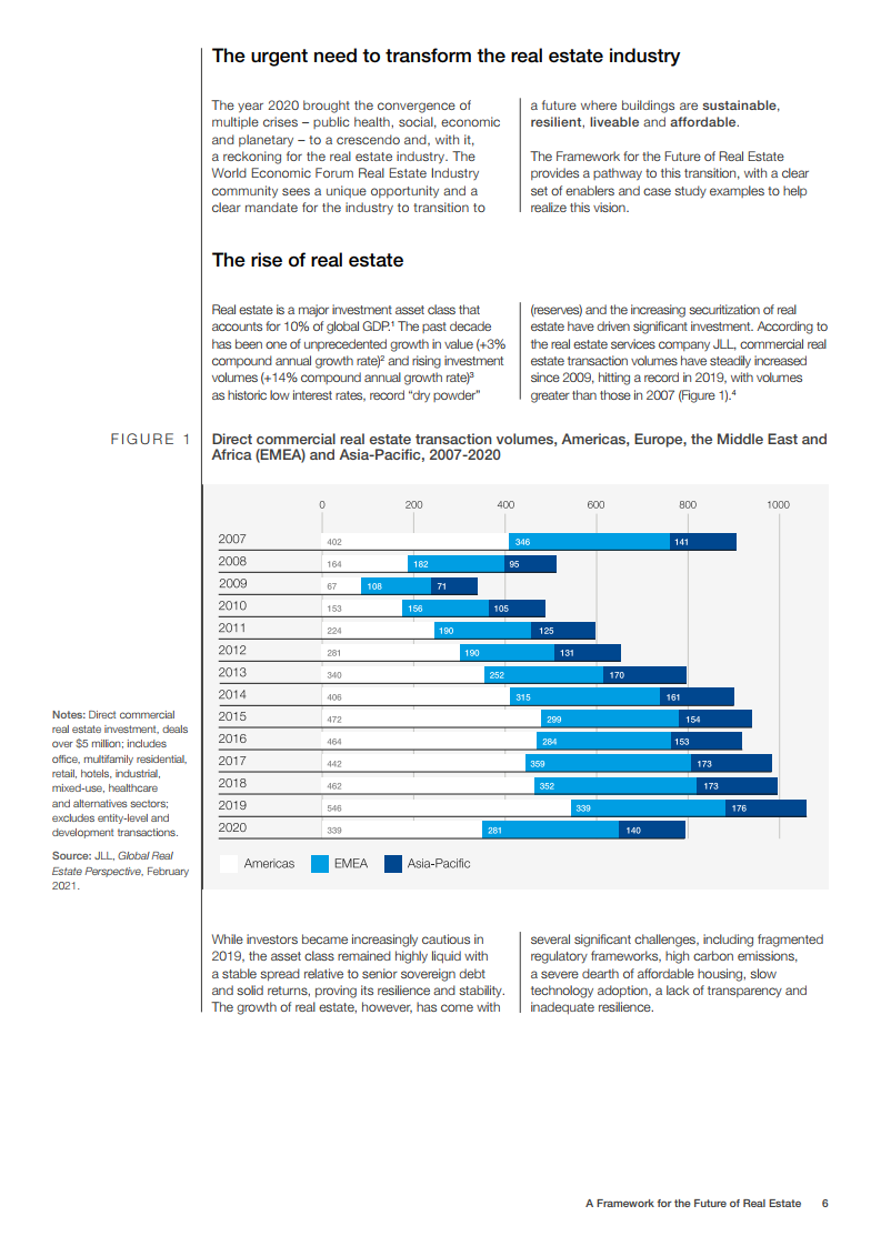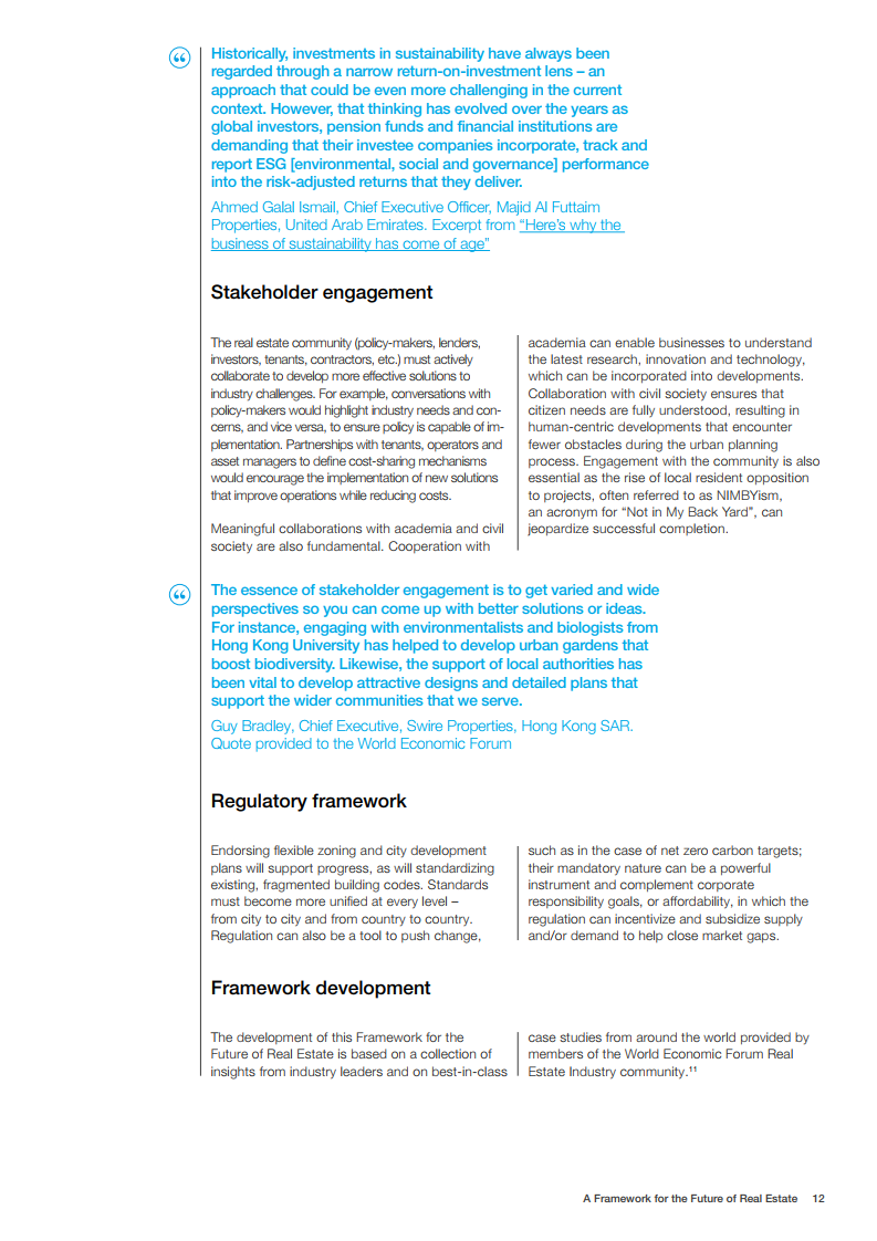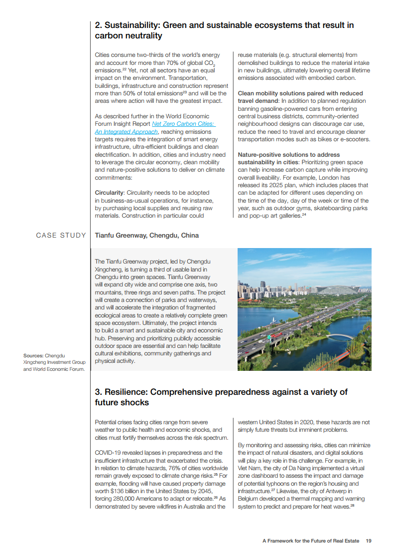 世界经济论坛的房地产社区已对房地产的未来发展做出了展望。在未来,建筑物将为人们提供舒适感,可以应对前所未有的事件,为人们的健康提供支持,并且是全社会负担得起的。在这一愿景中,未来的房地产是宜居、可持续、有弹性和负担得起的。为了实现这一概念,世界经济论坛制作了《房地产的未来框架》报告。该框架报告为该行业过渡到技术更先进、价格可承受、可持续和健康的建筑提供了一条途径。它还描述了来自全球创新和成功房地产案例研究的最佳实践和业务解决方案,并概述了针对公共和私营部门的建议措施。