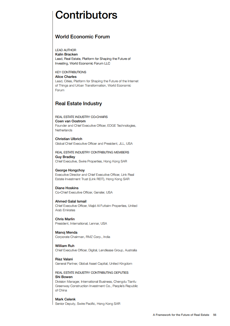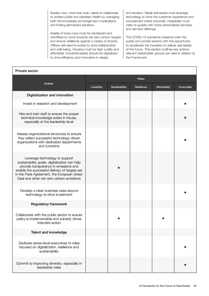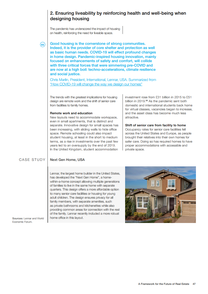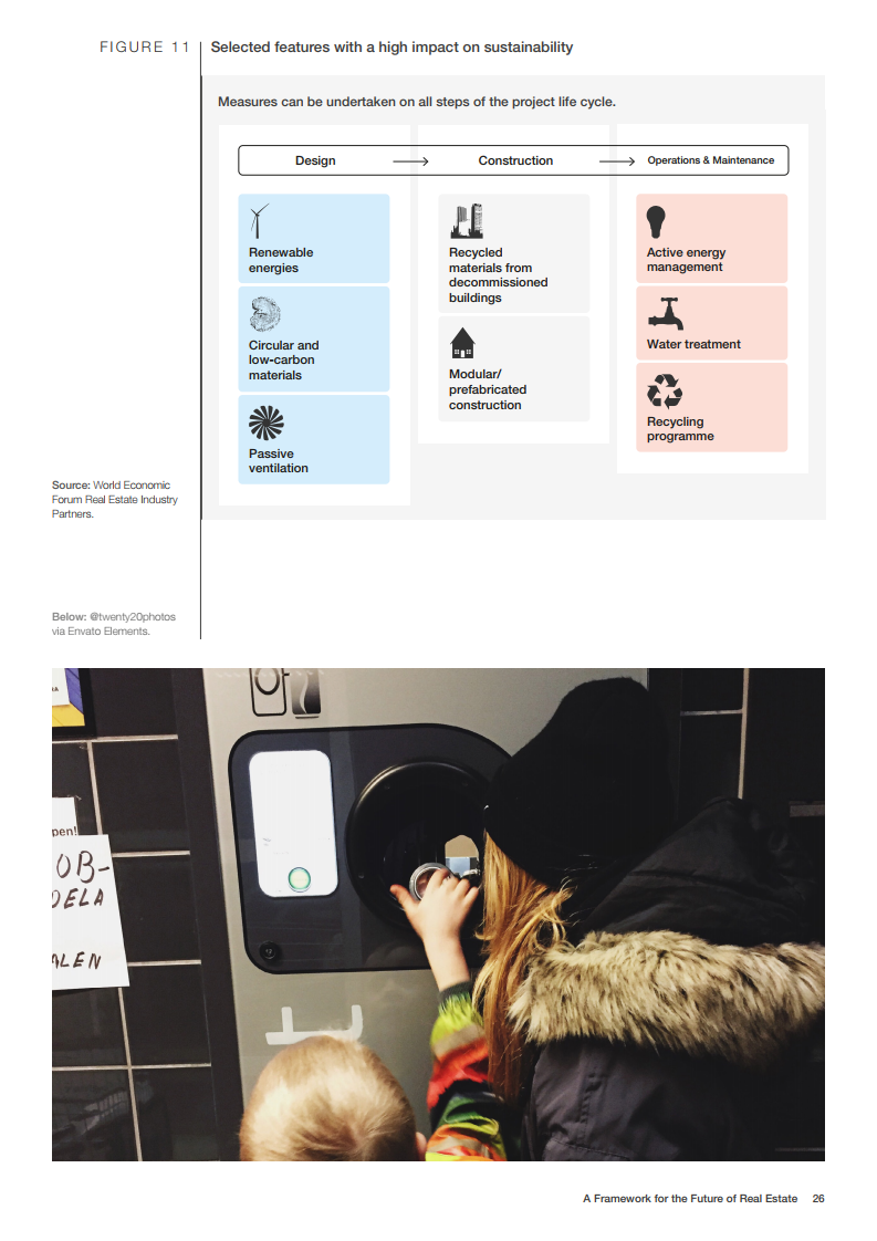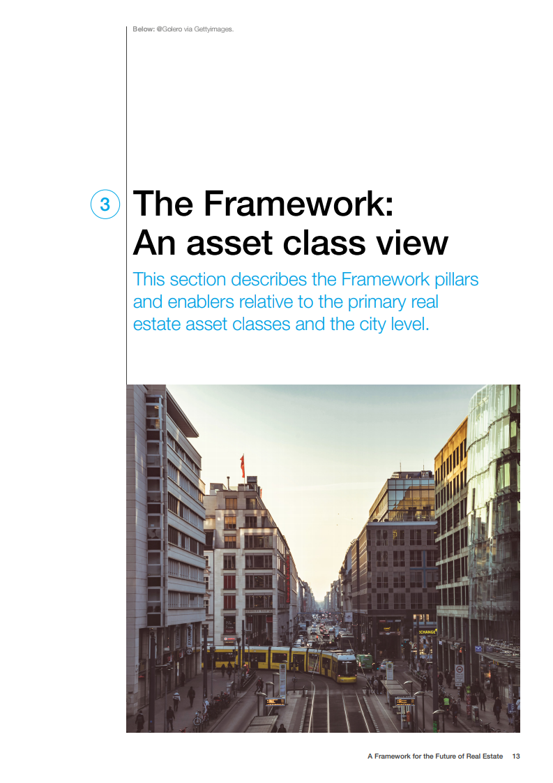 世界经济论坛的房地产社区已对房地产的未来发展做出了展望。在未来,建筑物将为人们提供舒适感,可以应对前所未有的事件,为人们的健康提供支持,并且是全社会负担得起的。在这一愿景中,未来的房地产是宜居、可持续、有弹性和负担得起的。为了实现这一概念,世界经济论坛制作了《房地产的未来框架》报告。该框架报告为该行业过渡到技术更先进、价格可承受、可持续和健康的建筑提供了一条途径。它还描述了来自全球创新和成功房地产案例研究的最佳实践和业务解决方案,并概述了针对公共和私营部门的建议措施。
