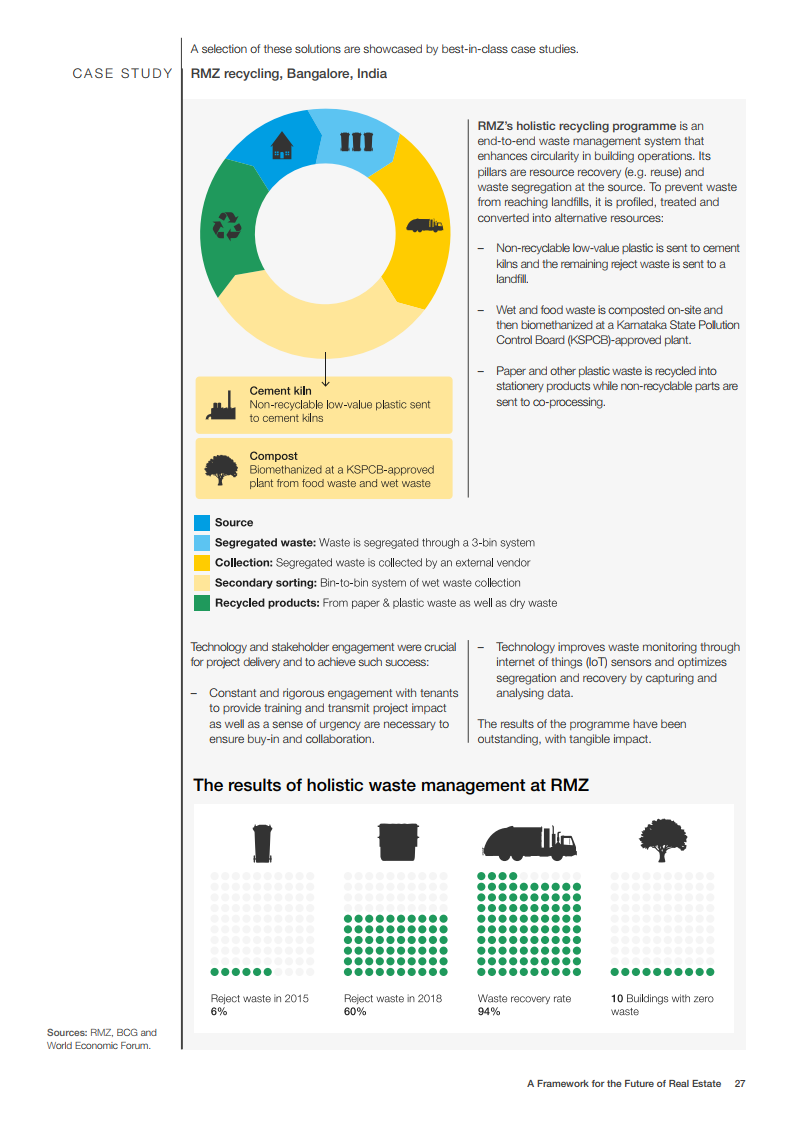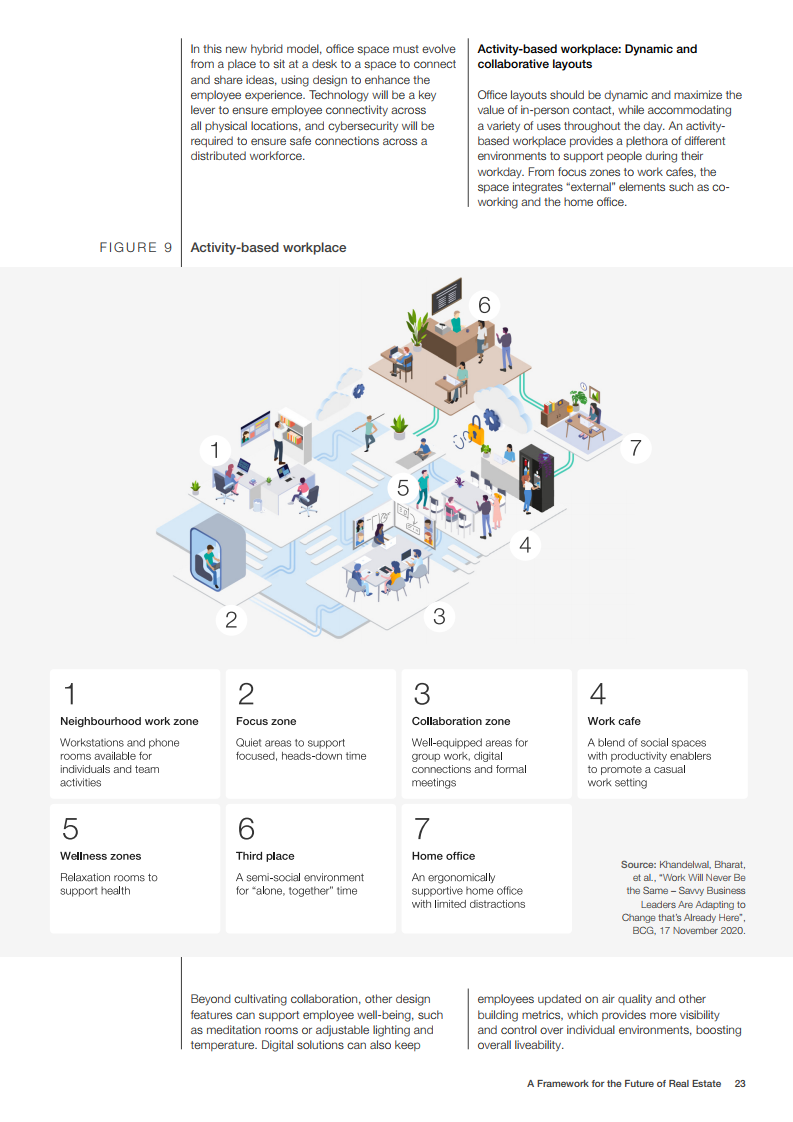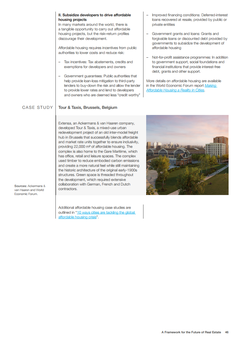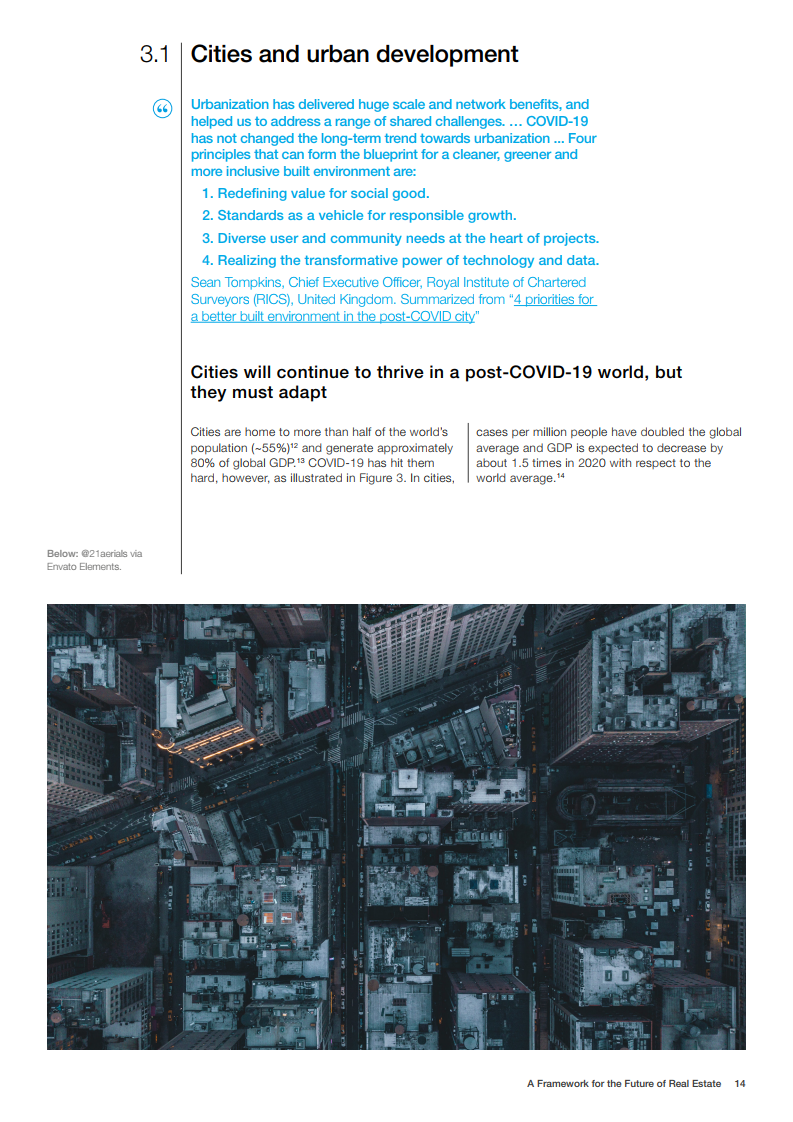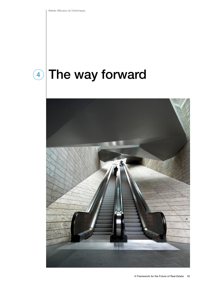 世界经济论坛的房地产社区已对房地产的未来发展做出了展望。在未来,建筑物将为人们提供舒适感,可以应对前所未有的事件,为人们的健康提供支持,并且是全社会负担得起的。在这一愿景中,未来的房地产是宜居、可持续、有弹性和负担得起的。为了实现这一概念,世界经济论坛制作了《房地产的未来框架》报告。该框架报告为该行业过渡到技术更先进、价格可承受、可持续和健康的建筑提供了一条途径。它还描述了来自全球创新和成功房地产案例研究的最佳实践和业务解决方案,并概述了针对公共和私营部门的建议措施。