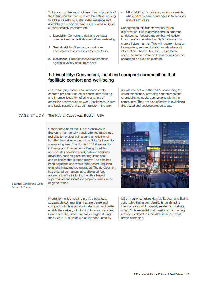 本报告还通过愿景和促进因素的视角,探讨了每个主要的房地产资产类别和整体城市景观。在城市层面,研究和案例研究表明,具有足够密度的混合用途开发可以支持可持续性和宜居性,并提供无数的下游效应,包括缩短通勤时间、降低排放、提高经济产出和复原力。大流行病的不均等破坏和平行的经济和社会挑战强调了恢复工作需要优先考虑可负担性、宜居性和包容性,以及增加公共和私人合作以解决其复杂性。