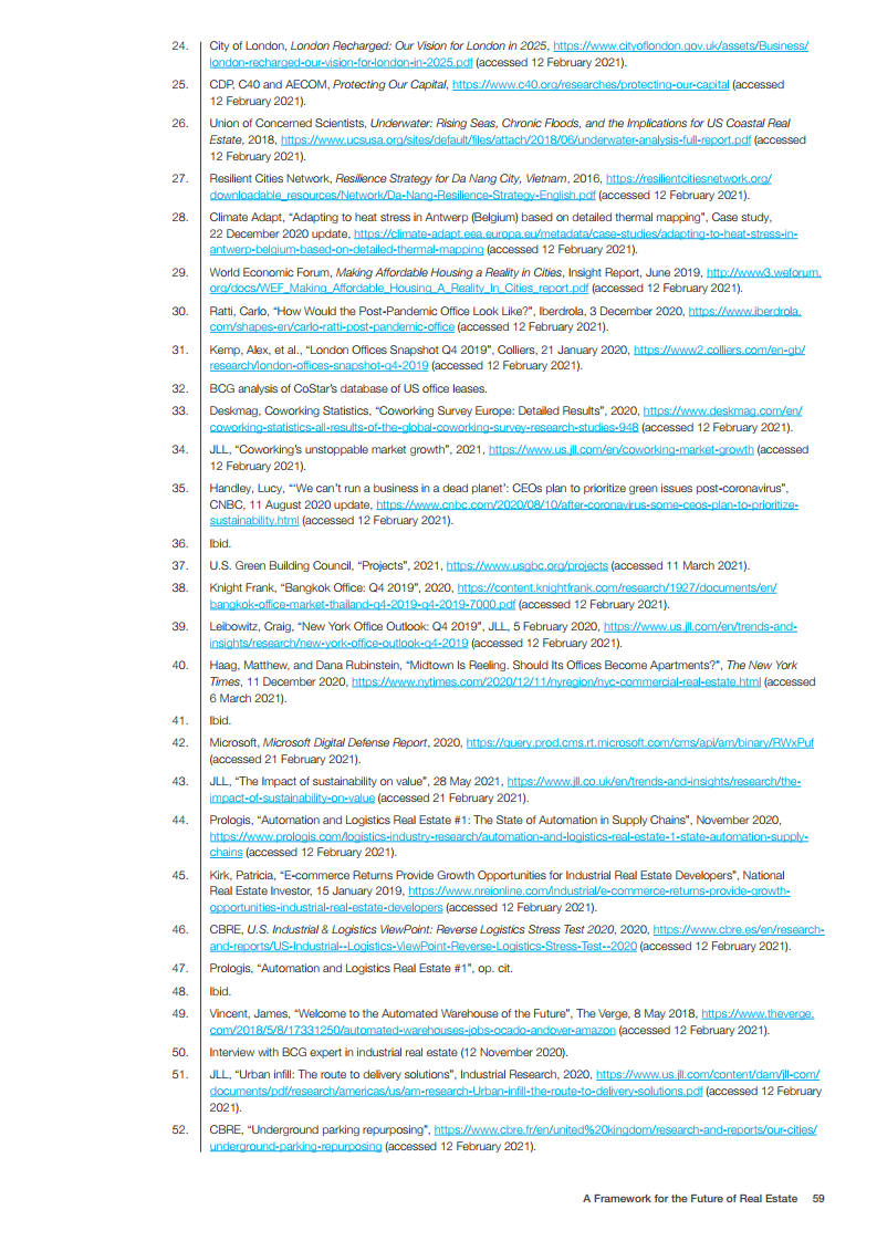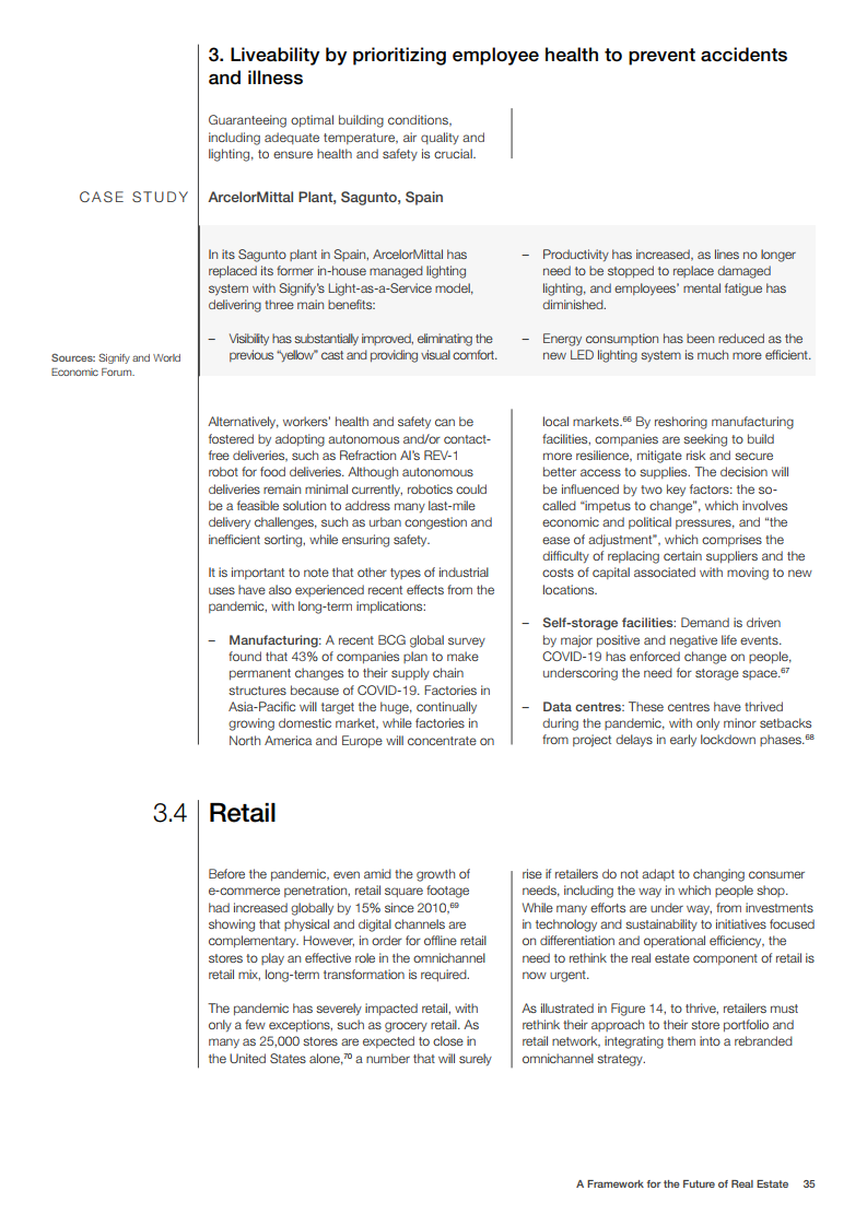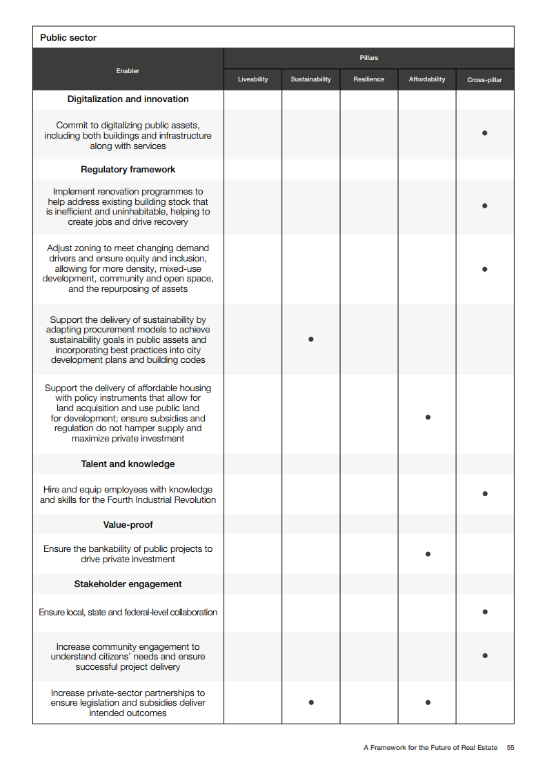 在资产类别层面,办公室和住宅必须不断发展以满足混合工作模式,而协作将是办公室重新设计的核心。案例研究清楚地表明,数字化是每个资产类别转型的基础,对于实现可持续发展目标和抵御冲击至关重要。虽然经济适用房比以往任何时候都更依赖于私人融资,即使在预算赤字的情况下,城市一级的政府可以通过提供自己的土地和资产,以及战略监管来刺激发展,在支持供应方面发挥关键作用。