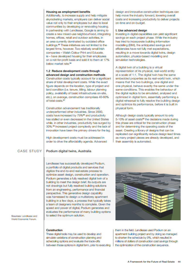 本报告中描述的“房地产未来框架”提供了一系列促进因素,包括加速数字化和创新,以解决从建筑成本到居住者体验的一切问题;提高技能并吸引具有特定才能和数字化及可持续性知识的工人;为技术、可持续性和经济适用房的投资展示清晰、有价值的商业案例;让整个行业价值链和当地社区的利益相关者参与其中;确保监管框架能够解决供应挑战和可持续性目标,并提供适当的分区和密度。