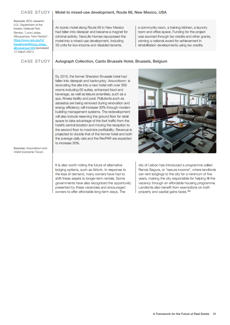 大流行病加速了需求驱动因素的变化,这可能会使办公、酒店和零售业的过剩供应变得过时。写字楼、酒店和零售业的过剩供应可能会被淘汰,这就需要对资产进行广泛的翻新和重新利用,最终改变社区的构成。案例研究描述了成功的适应性再利用,包括可持续性和可负担性的目标。