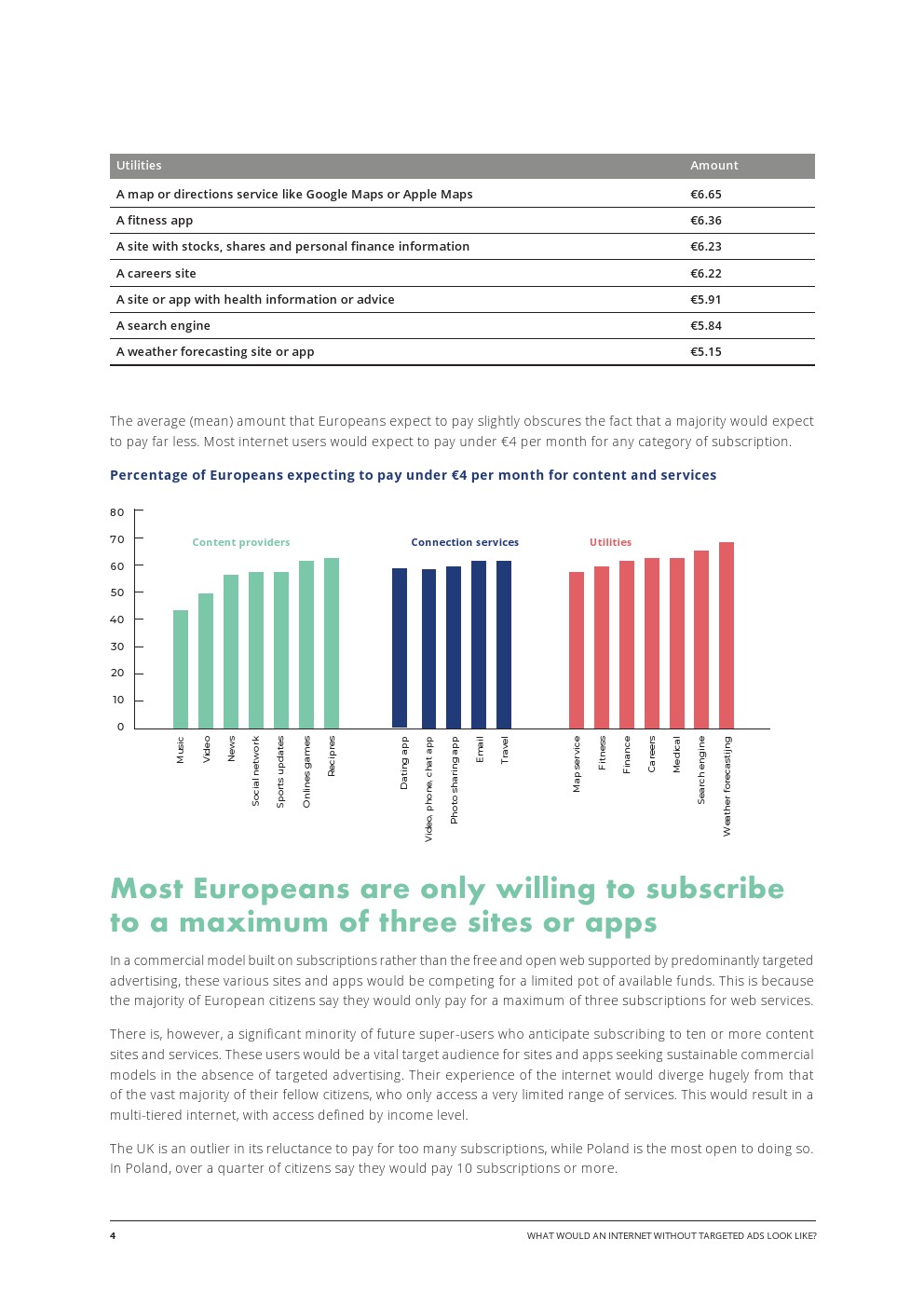 近一半的欧洲人(48%)表示,他们将避免付费订阅,从而大大减少他们的互联网活动。大多数人(78%)表示他们会在一定程度上减少他们的网络活动。平均每个欧洲人订阅和付费访问的网站总数不到5个;51%的欧洲人只愿意订阅三个或更少的网站或应用程序。大多数欧洲人希望他们目前使用的大多数网络服务每月订阅费用不超过4欧元。音乐流媒体(51%)和电子邮件(50%)是大多数欧洲人订阅的唯一网站和服务。不到1、3的欧洲人愿意为天气预报(32%)、财务内容(31%)、新闻(28%)或体育(26%)付费。75%的受访者表示他们受益于相关的、有针对性的广告;32%的受访者表示他们发现广告“总是”或“经常”有用。