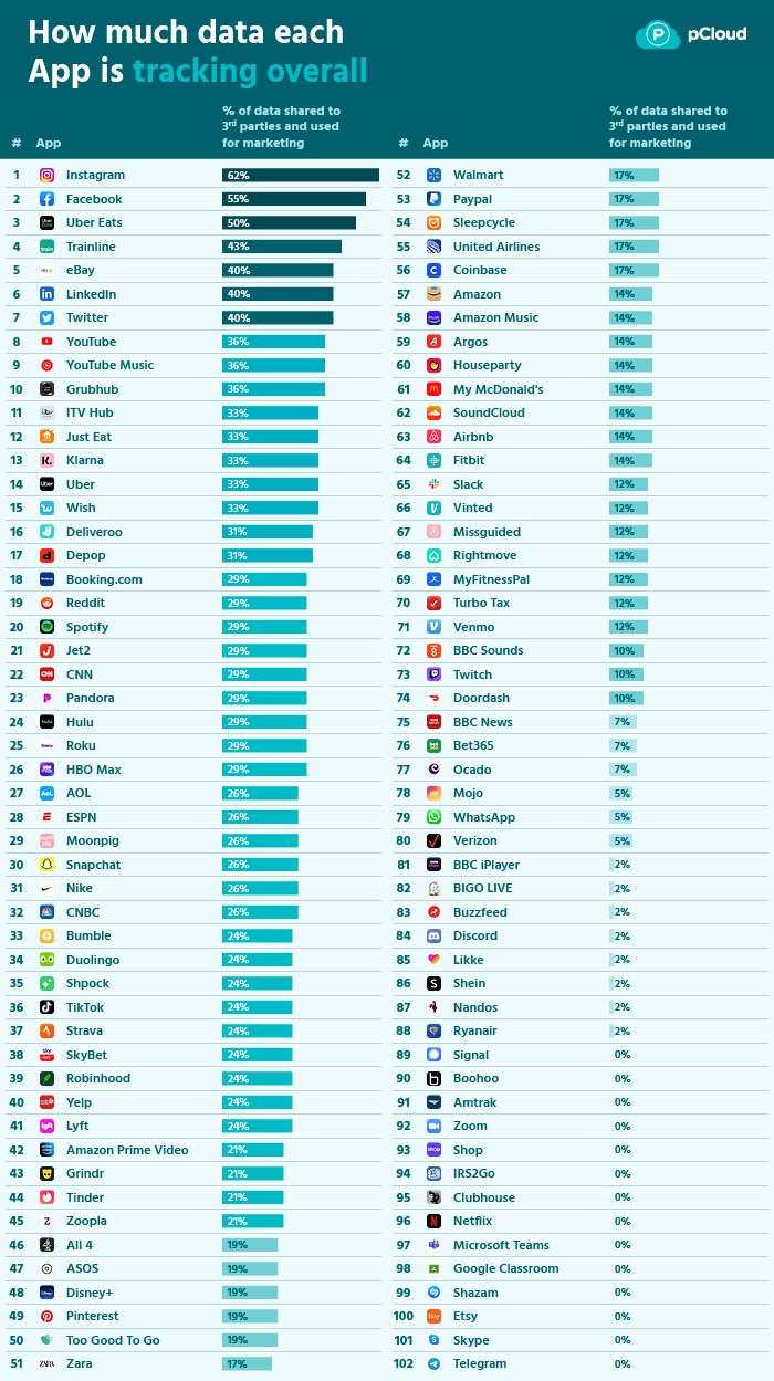 排名前两位的是Instagram和Facebook。这两个应用都来自Facebook公司,它们利用86%的数据向用户推销自己的产品,并代表第三方向用户提供相关广告。排在第二位的是Klarna和Grubhub,他们使用了64%的用户数据,Uber和Uber Eats使用了57%的用户数据。