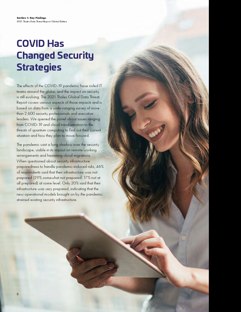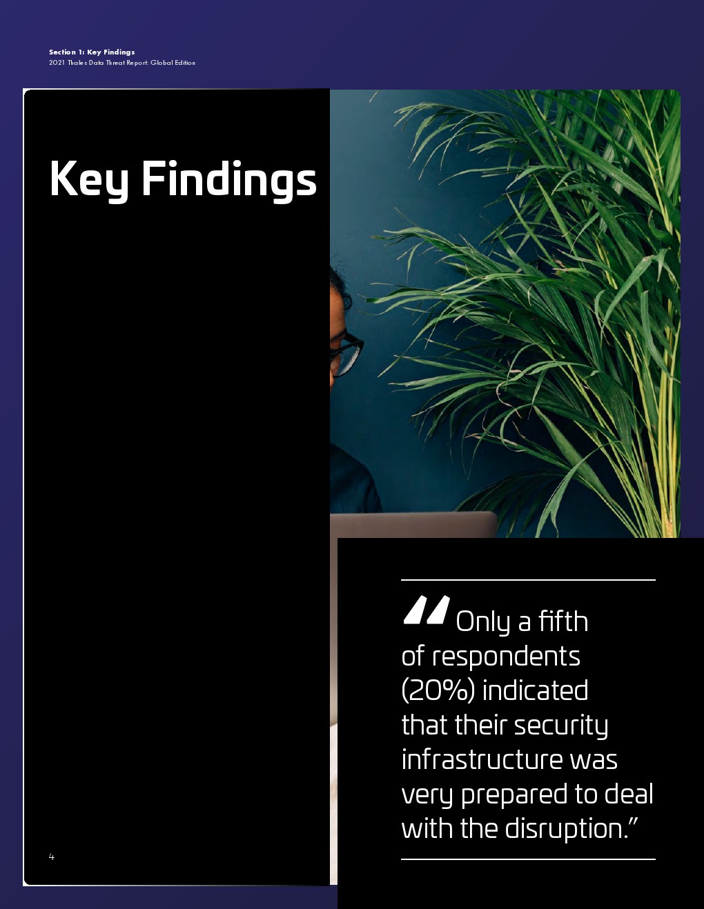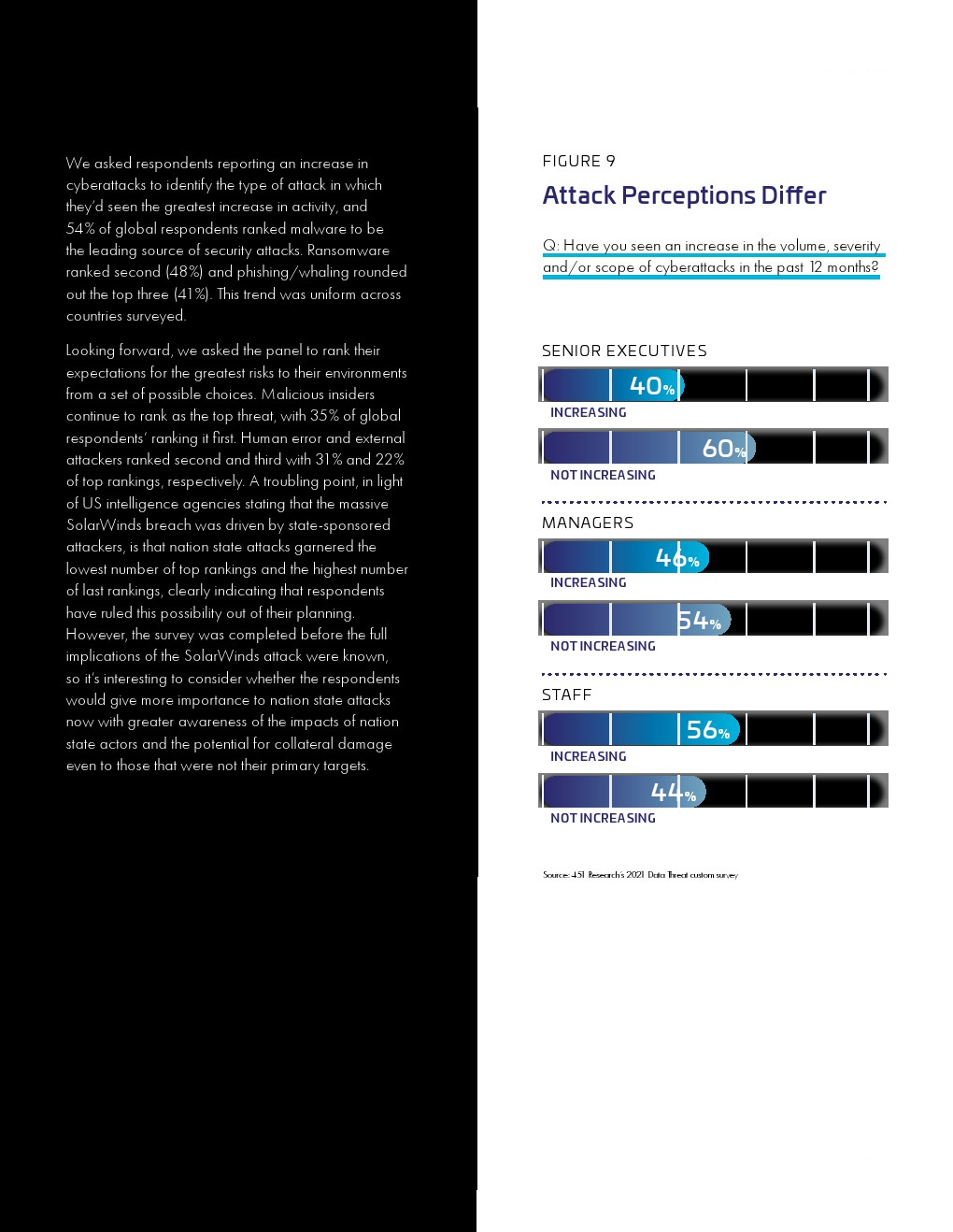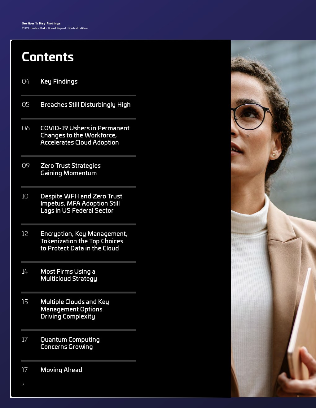 大流行的压力正在影响安全措施和支出。远程工作需要更有效风险管理。云迁移势头强劲,但许多必要的控制措施仍然滞后。用来保护云敏感数据的加密使用率仍然很低。全球对不断变化的风险的意识很高,但这并没有促使企业应对这些风险。入侵事件及其影响给安全规划带来了压力。管理层和从业人员对安全的理解的不一致可能会影响规划和预算。传统的安全担忧依然存在。量子计算的风险引发了人们对安全规划的担忧。