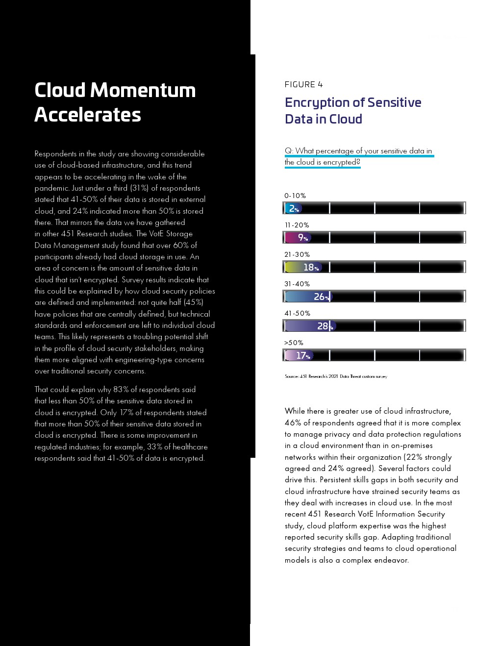 云计算使用量增加似乎也给安全运营带来了压力。加密等数据保护机制似乎没有随着公共云使用量的增加而扩大。31%的受访者表示其41%-50%的工作负载和数据驻留在外部云,24%的受访者表示超过一半。只有17%的企业已经通过加密保护了云中50%以上的敏感数据。