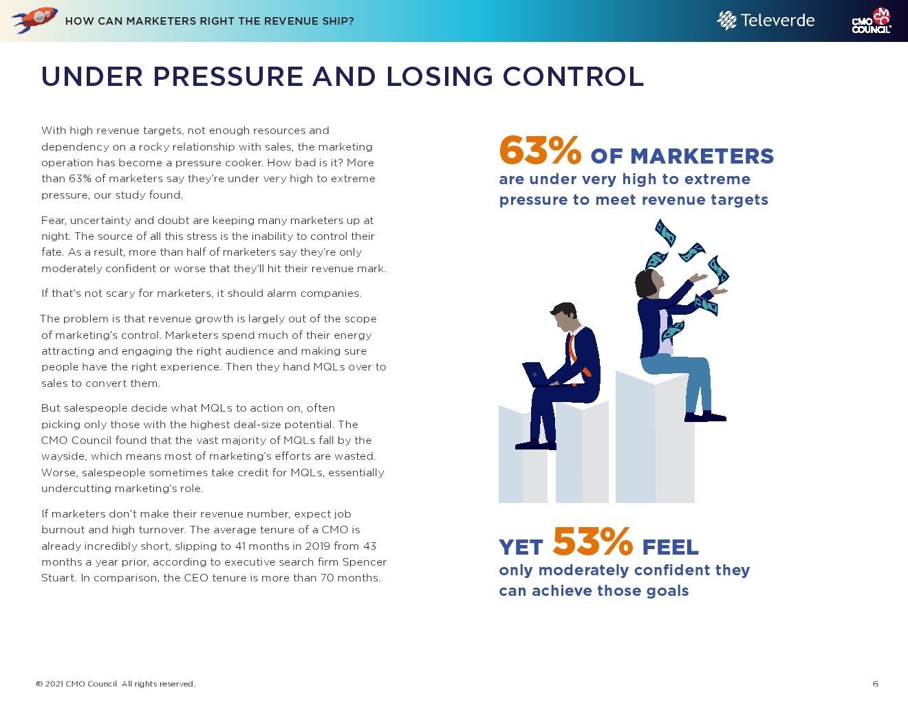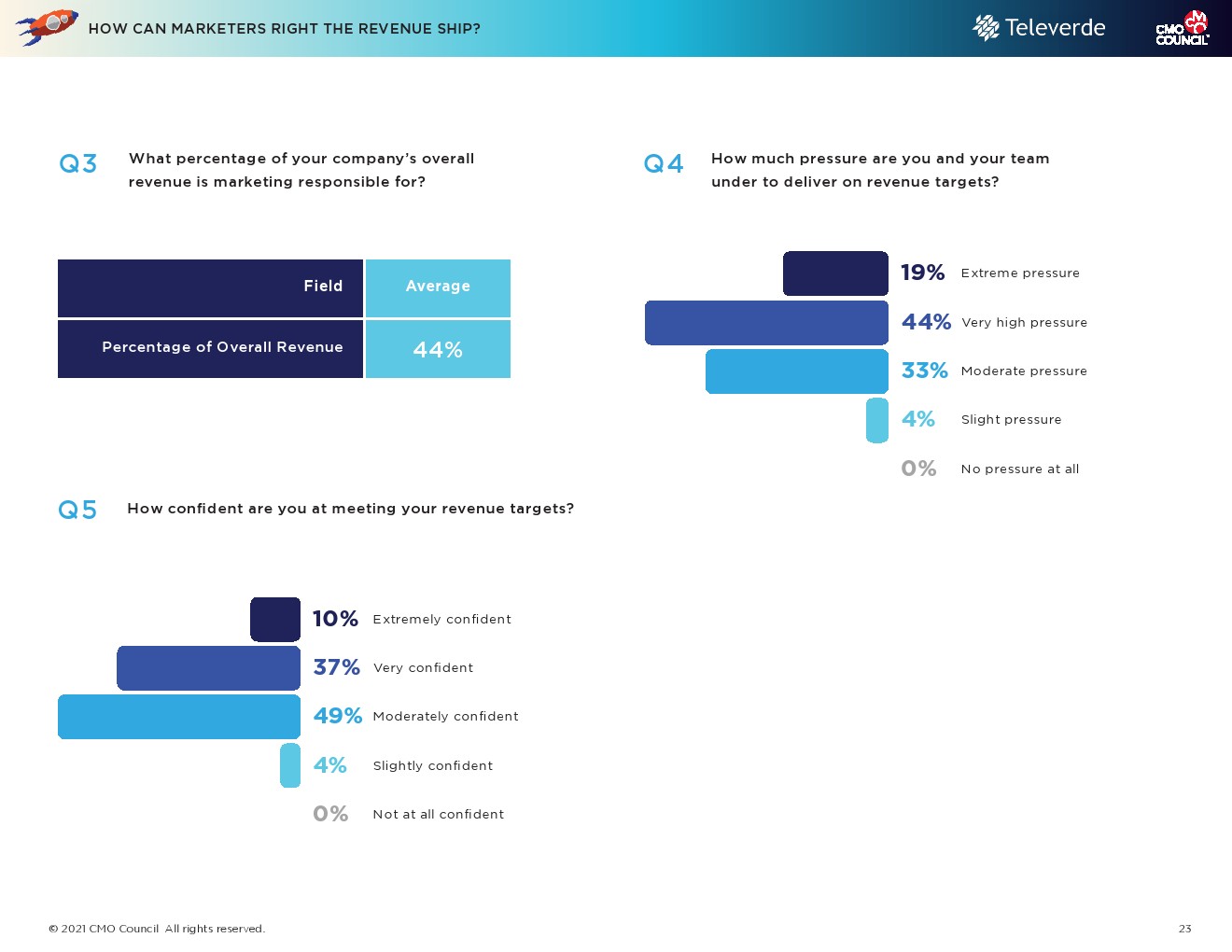 这些营销领袖表示,平均而言营销占公司总收入的44%。虽然只有1/10的人对实现收入目标非常有信心,但约一半的受访者(49%)只是稍有信心。尽管如此,所有受访者都表示,他们和他们的团队都面临着实现收入目标的压力,约2/3的受访者面临着极大(19%)或非常大(44%)的压力。