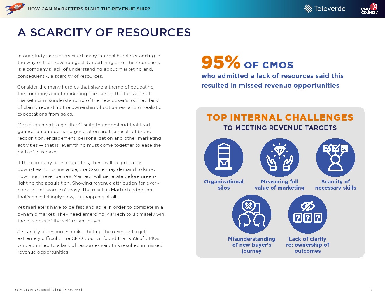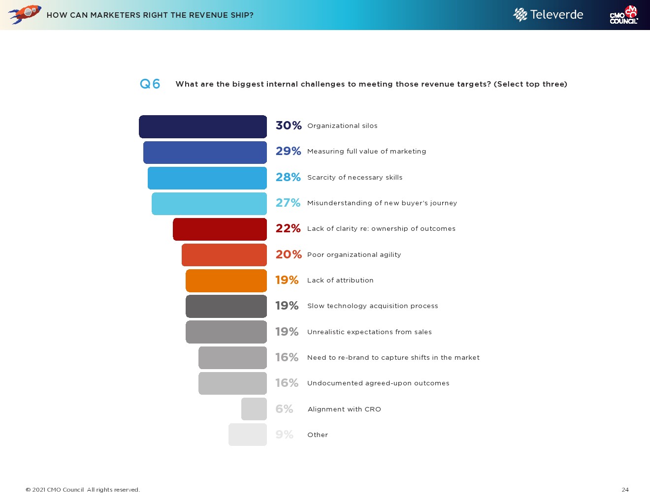 当被要求说出营销人员所遇到的内部挑战时,受访者最有可能将企业孤岛(30%)列为前三名,其次是测量营销的全部价值(29%)。