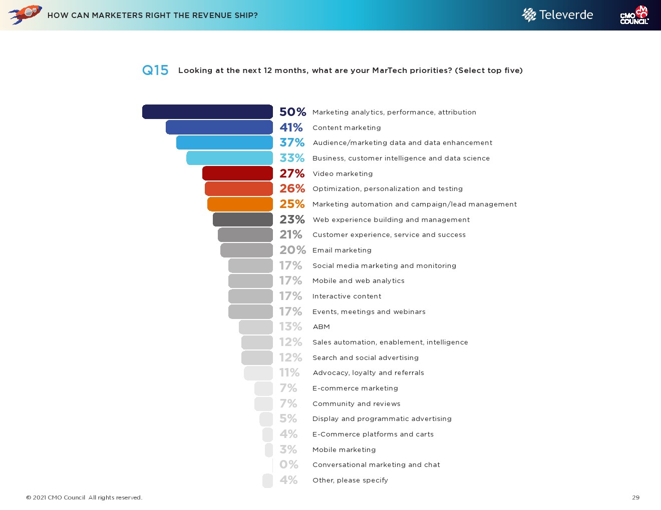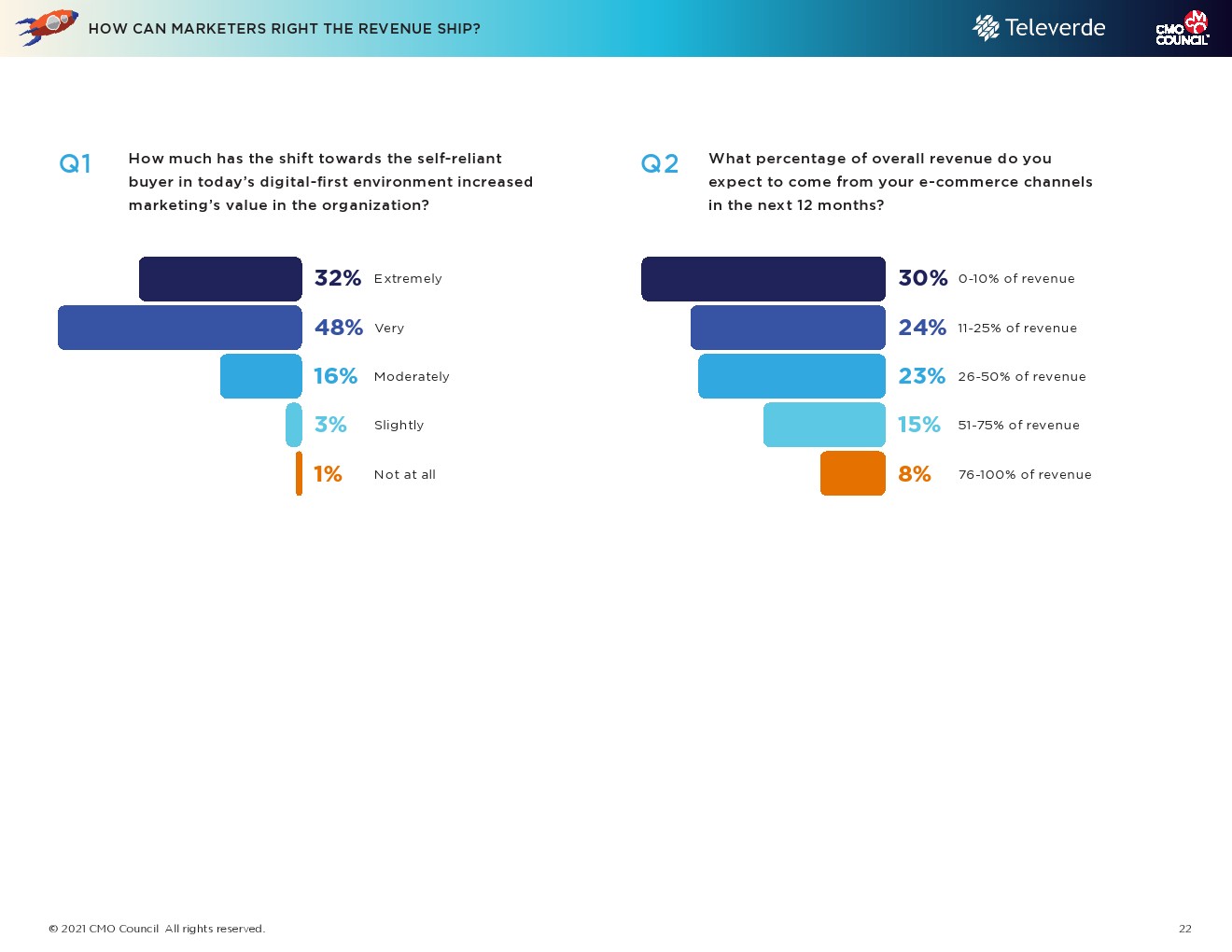 大流行导致的向数字和电子商务的加速转型将成为一种永久的行为,近半数的受访营销领袖(46%)预计,在未来12个月内电子商务渠道将占其总收入的26%。