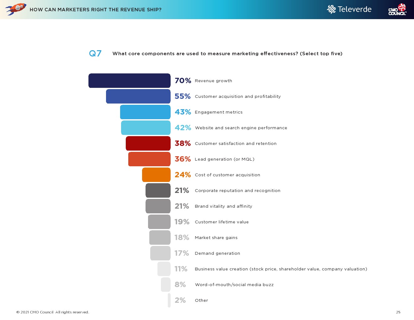 克服这些挑战非常重要,因为每10名受访者中就有7人表示,测量营销效果的前5大要素之一是收入增长。用于衡量营销有效性的其他核心组成部分包括获取客户和盈利的能力(55%)、敬业度指标(43%)以及网站和搜索引擎性能(42%)。