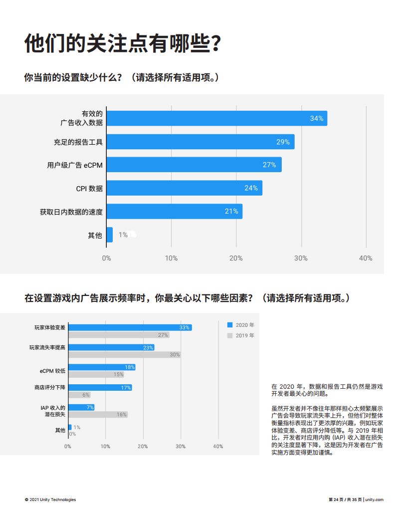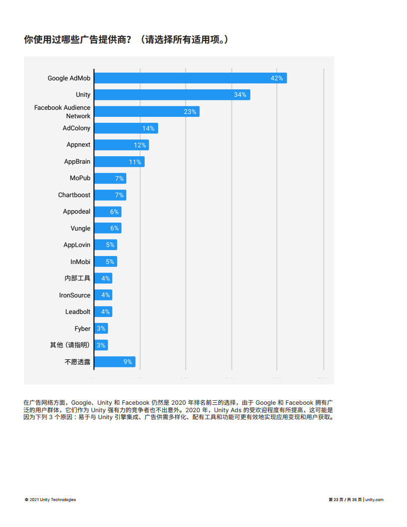 Unity仍然是首选的游戏引擎,接受调查的开发人员中有61%的人使用Unity。同时Unity也是在移动广告网络领域的第二选择。
