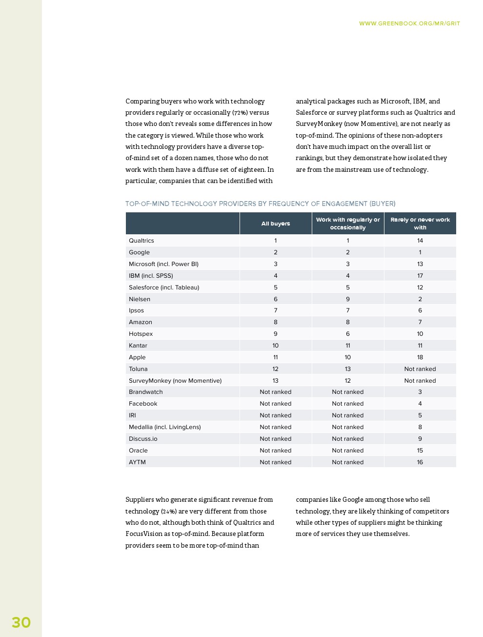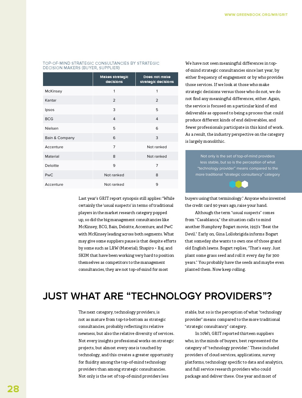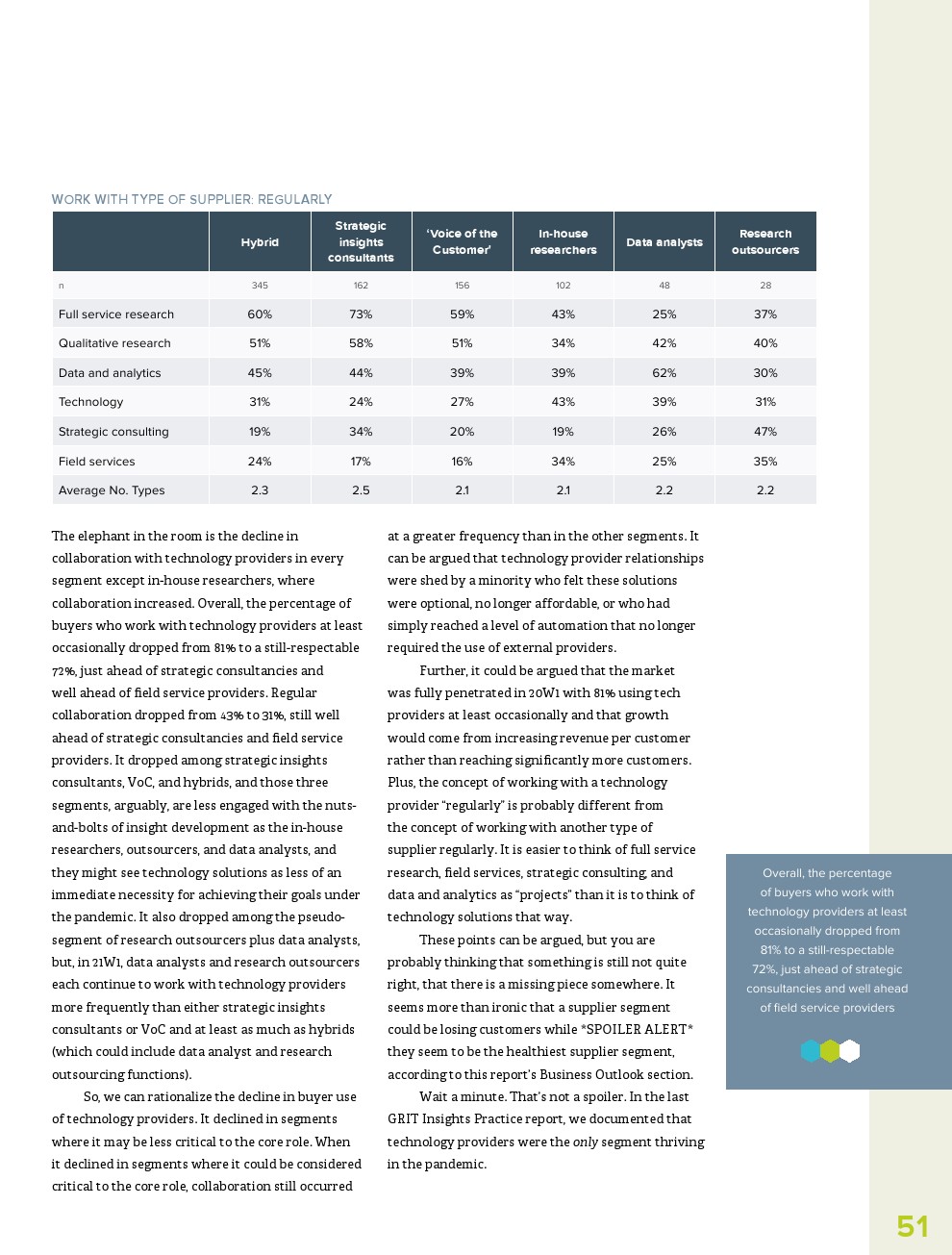 GRIT调查了哪些市场研究供应商是最具创新性的,并要求从5个类别中选择一个来描述这些公司:数据和分析提供商;正式和/或现场服务机构;定性研究提供者;战略咨询;或技术提供商。