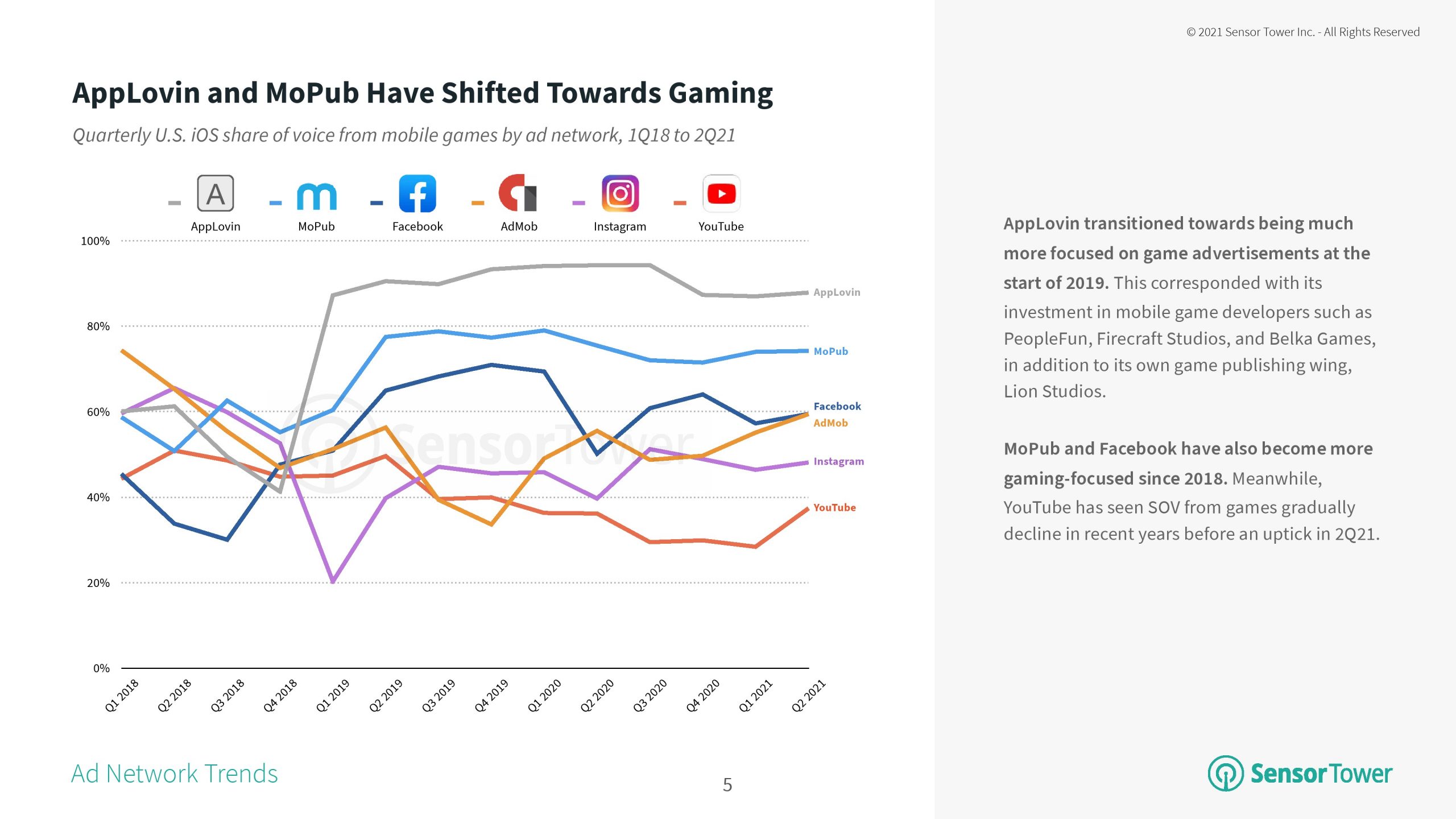 2018年第一季度至2021年第一季度,五家广告网络主要专注于手机游戏,其媒体占有比重(SOV,share of voice是指某品牌广告的总收视点占该类商品广告的总收视点的比重)至少有90%来自iOS的游戏。自2019年以来,AppLovin有90%以上的iOS SOV都来自游戏。