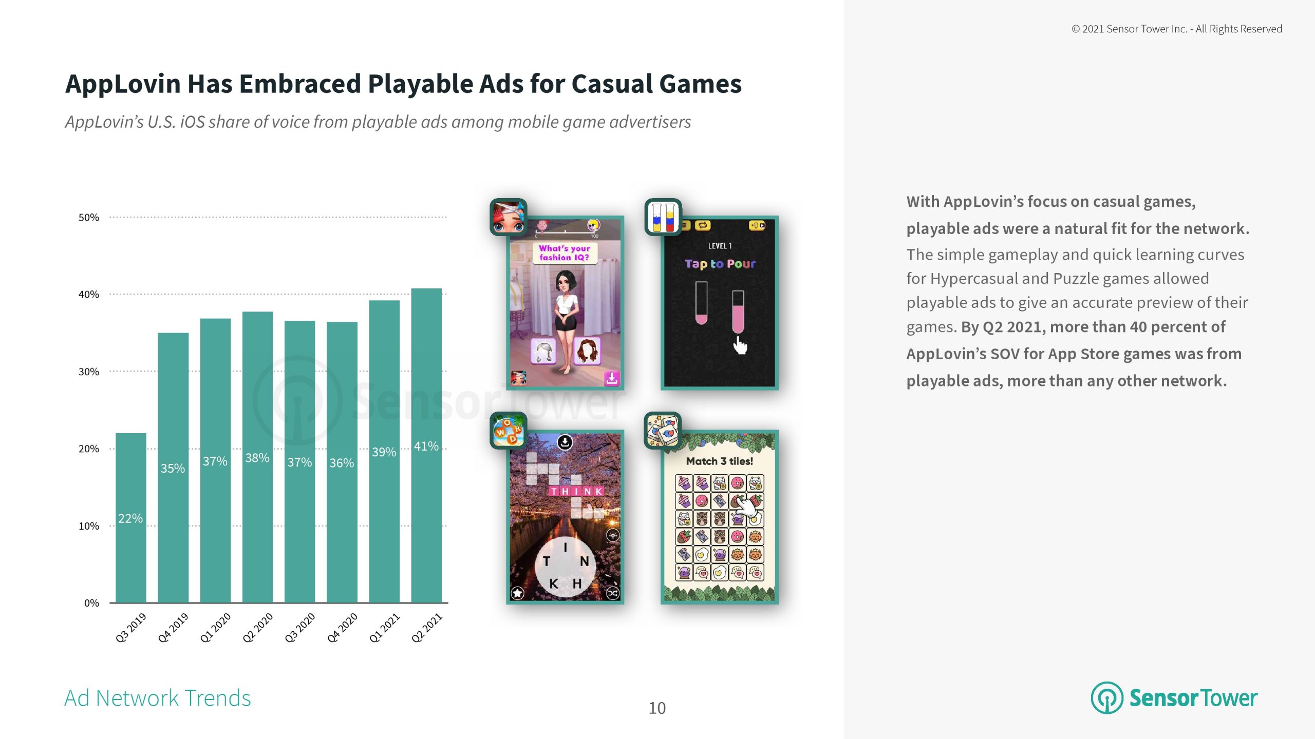 在所分析的网络中有五个在游戏和非游戏之间的分布更为均匀。AdMob、Instagram、Facebook、TikTok和YouTube有40%-60%的SOV来自游戏。当然,这些网络仍然是手机游戏广告的重要选择。