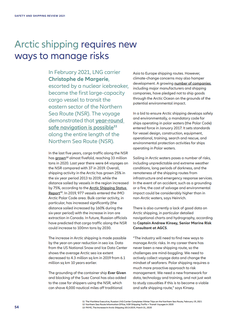 海运供应链的恢复力也成为人们关注的焦点。如“长赐号”事件给依赖海运的全球供应链带来了冲击。它加剧了贸易争端、极端天气、新型冠状病毒肺炎疫情的影响并且对集装箱货物和大宗商品的需求激增已经造成的延误和中断。对此,AGCS高级海洋风险顾问AndrewKinsey船长说,“开发更强大和多样化的供应链将变得越来越重要,理解关键节点和供应链节点也将变得越来越重要。”
